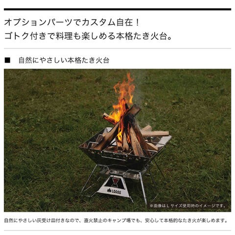 オプションパーツでカスタム自在!ゴトク付きで料理も楽しめる本格たき火台.ゴトクを標準装備した新登場のたき火台は簡単組立て約10秒.2個のゴトクが互いに補強しあう独自構造により抜群の強度を実現.ダッチオーブンを置いての料理はもちろん、付属の串焼きプレートを使って魚の串焼き料理なども楽しめる.オプションパーツも充実しています.自然にやさしい灰受け皿付きなので、直火禁止のキャンプ場でも、安心して本格的なたき火が楽しめます.主要パーツは6個のみ.パーツを重ねるだけなので、誰でも簡単に約10秒で組立てが可能.撤収も同様です.収納バッグ付きで持ち運びも簡単です.