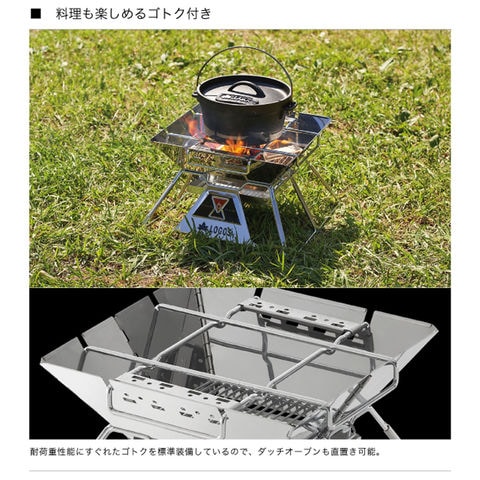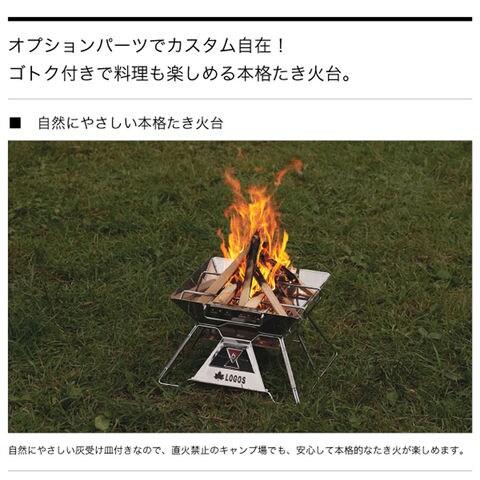 オプションパーツでカスタム自在!ゴトク付きで料理も楽しめる本格たき火台.ゴトクを標準装備した新登場のたき火台は簡単組立て約10秒.2個のゴトクが互いに補強しあう独自構造により抜群の強度を実現.ダッチオーブンを置いての料理はもちろん、付属の串焼きプレートを使って魚の串焼き料理なども楽しめます.オプションパーツも充実しています.※製品は予告なく仕様を変更する場合があります.