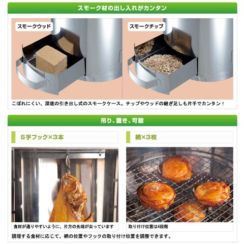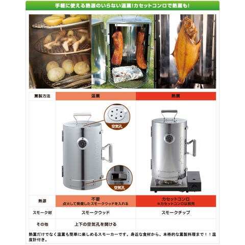 特長:簡単!バーナーがいらないスモーカー/もちろんバーナーを使った熱燻も楽しめます