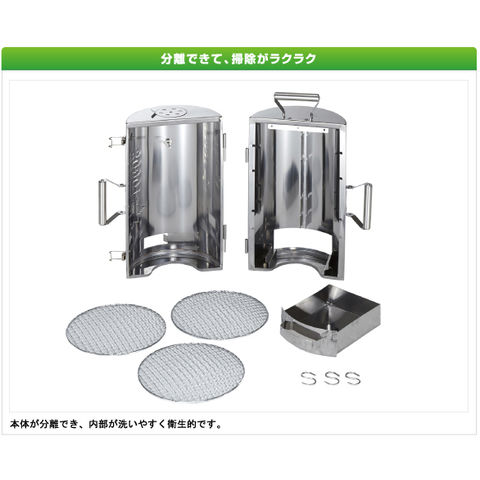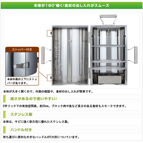 簡単!バーナーがいらないスモーカー.[大きく開閉できて調理と清掃に便利][誰でも簡単にできるスモーカー]・・・本体が中央から大きく開閉でき調理と清掃に便利なタワー型スモーカーです.本体を簡単に分離できるから洗浄も簡単.お手入れが簡単なステンレスボディでスモークウッドを使えばバーナーやコンロが無くても簡単にスモークが楽しめます.