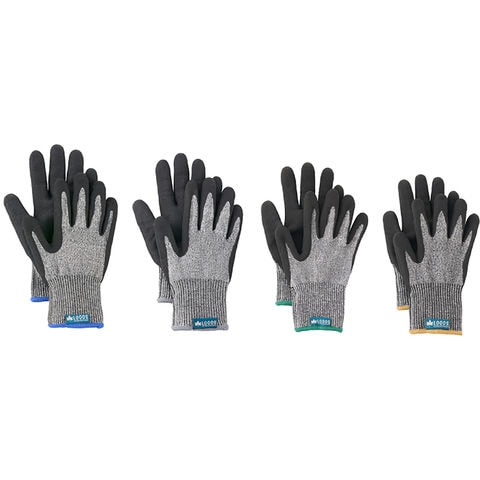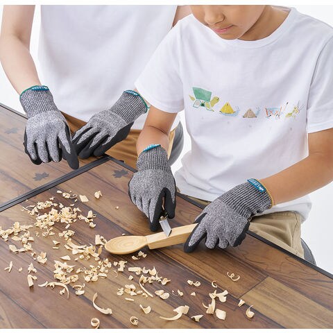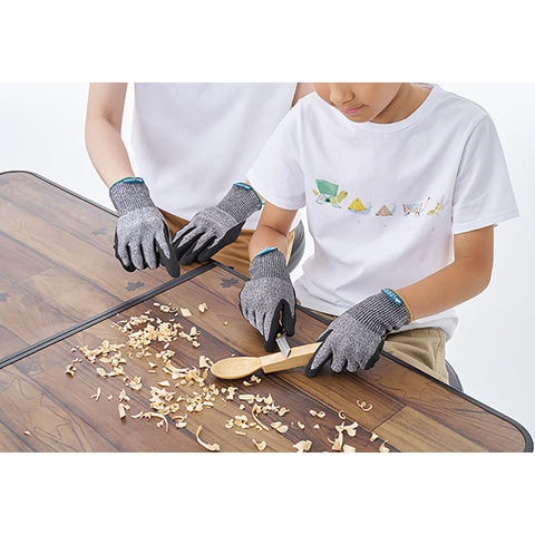 刃物を用いる作業時に手を保護する専用手袋.ゴムコーティングによる抜群のグリップ力で作業をサポートします.刃物で切れにくい生地を使用したグローブ.企業が工場などで使用する基準をクリアしており、生地の安全性はお墨付き.手のひらの面はゴムで覆われているためグリップ力が高く、どんな作業も快適.親子でもお揃いで着用できる、うれしい 4 サイズ展開です.キャンプやブッシュクラフトなどのアウトドアから園芸、 DIY 、などさまざまなシーンで活躍します.