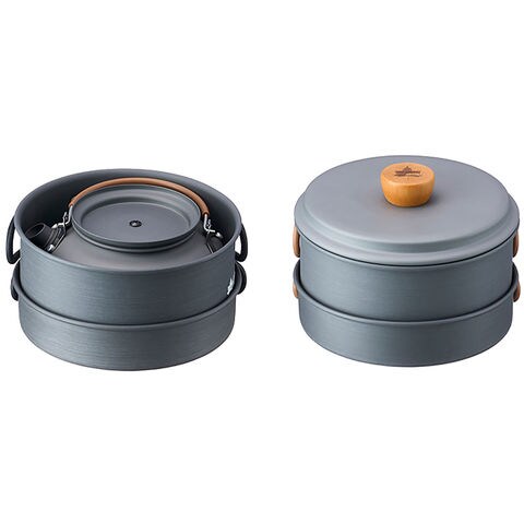 持ち運びラクラク!木製つまみ付きの1人~2人向け軽量クッカー&ケトルセット.キャンプや野外フェスなど、アウトドアシーンで便利なクッカー&ケトルセットです.このセットで炒める、焼く、煮る、茹でるなど色々な調理方法に対応し、ケトルはコーヒーなどを入れる際にも便利.軽量なのでキャンプや登山に持ち運びができ、万が一の災害時の調理器具としても重宝します.また、全てスタッキングして収納できるため保管にも場所を取りません.ポット、ケトルにはメープルリーフのロゴ入りの木製のつまみがついており、調理中も熱くならずにお持ちいただけます.ハードアルマイト加工により丈夫で傷がつきにくく耐久性・強度アップ.長く愛用いただけます.また、持ち手は