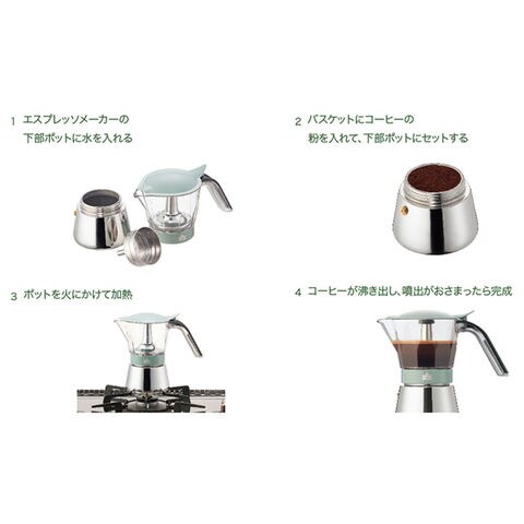 機能:ポット上部が透明だから、抽出過程を楽しめるエスプレッソメーカーです./コーヒーも抽出OK!/家庭用コンロやアウトドア用バーナーでお使いいただけます.
