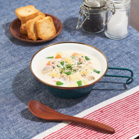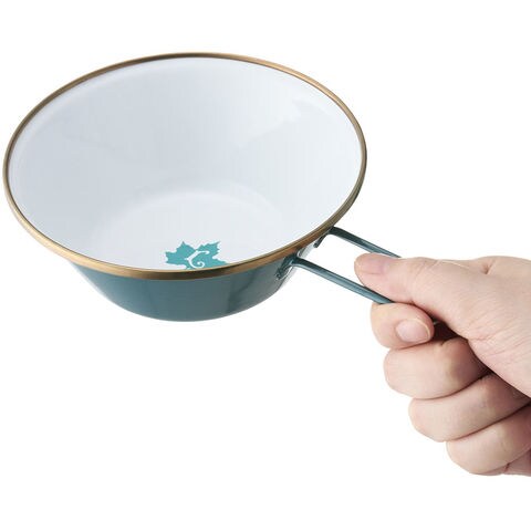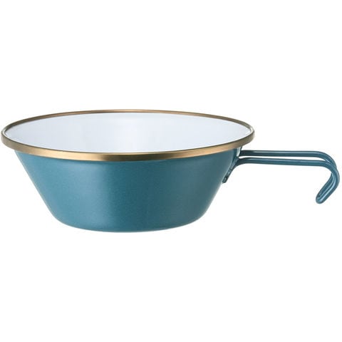 熱やにおいに強く、長く使える!調理や取り皿に使えるホーロー製シェラカップ.耐熱性・耐久性に優れ、においもつきにくいホーロー製のシェラカップ.スープや取り皿としても使いやすい容量310mlサイズ.直火やオーブンでの調理や温め直しができ、自宅でもアウトドアでも活躍します.取っ手は指をかけやすい形状です.ホーローの特長として、保温性・保冷性に優れているため、冬はあたたかい料理が冷めにくく、夏は冷たい料理がぬるくなりにくい.お手持ちのザックにカラビナなどで吊り下げることができます.経年劣化を楽しみながら長く愛用いただけます.ブラスカラーの口巻きが雰囲気のあるクラシカルなデザインです.