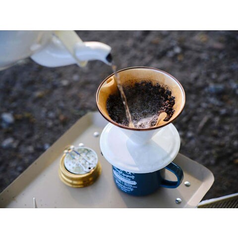 仕様:【使い方】(1)本体をカップにのせ、市販の円錐型コーヒーフィルター(1~2杯用)をセット.(2)ーヒー粉を入れ、熱湯を少し注ぎ、蒸らしてから適量となるまでお湯を注ぐ.におい・色がつきにくい琺瑯製のドリッパー.カップの中身が見える窓付き.