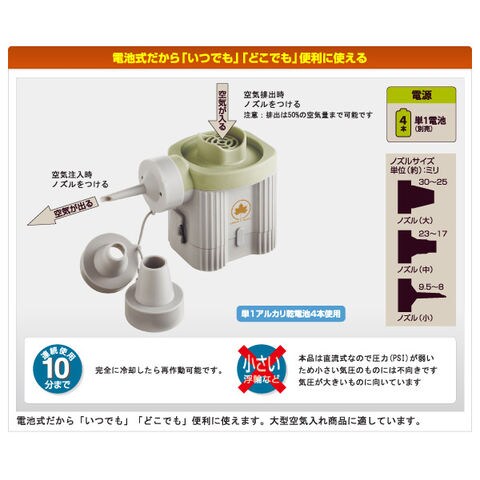 ●/電池式だから[いつでも][どこでも]便利に使える/大型空気入れ商品に適しています.小さな気室(空気の部屋)の商品には使用できません