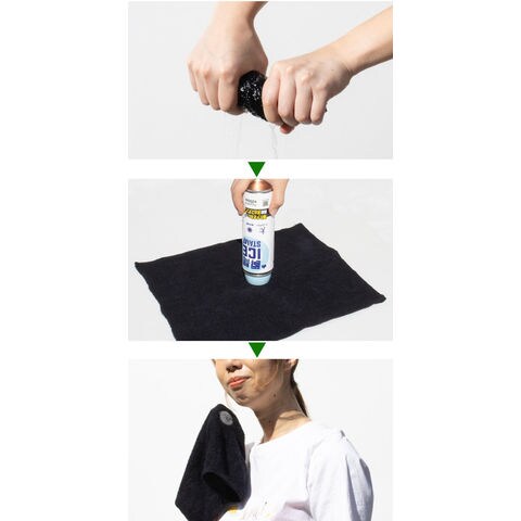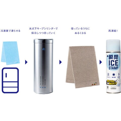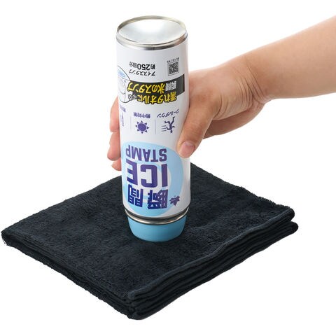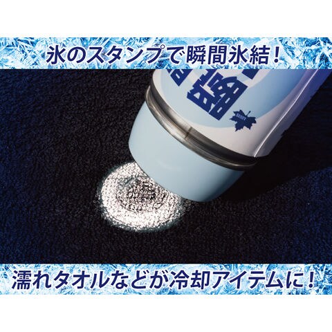 濡れタオルに瞬間アイススタンプ.濡らしたタオルやハンカチに直接プッシュするだけで、氷のスタンプができ冷却タオルとして使えるアイテム.界面活性剤不使用で水分を凍らせるため、衣類がシミになる心配もなく自然な使用感でソフトにやさしく使えます.また、無香料なので香りが苦手な方にもおすすめ.炎天下の屋外作業やスポーツ、アウトドアなど、気軽に持ち運べます.アイススタンプ約 250 回分使用できます.本製品の成分は 100% の LPG のみで、余計な化学物質が入っていません.環境にも肌にもやさしい[水だけでできた純粋な氷]ができます.自然な使用感で、化学物質による肌荒れの心配もございません.