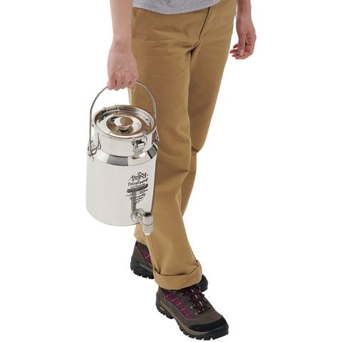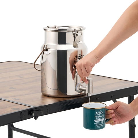 ワンランク上のウォーターディスペンサー.容量 5L のサビにくいステンレス製ウォーターサーバー.注ぎ方はコックをひねるだけです.鏡面仕上げで光沢感があり、中央にはレトロなロゴデザインをあしらっています.間口が広いため手を入れて掃除をすることができ、衛生的で長くお使いいただけます.使い込むほどに愛着も増し、経年変化も楽しめます.