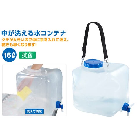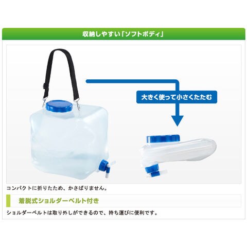 中が洗える水コンテナ.クチが大きいので中に手を入れて洗え、乾きも早くなります!菌の繁殖を抑える抗菌仕様.水も汲みやすく、氷もガバッと入ります.注ぎやすいスムーズ構造コック付き.水の出が気になる場合は、天ブタを緩めたり開けたりすることでコンテナ内の気圧低下を抑え、容器がへこむことなく、コックからスムーズに水を注ぐことができます.片手で操作できるコック付き.収納しやすい[ソフトボディ]コンパクトに折りたため、かさばりません.ショルダーベルトは取り外しができるので、持ち運びに便利です.※製品は予告なく仕様を変更する場合があります.
