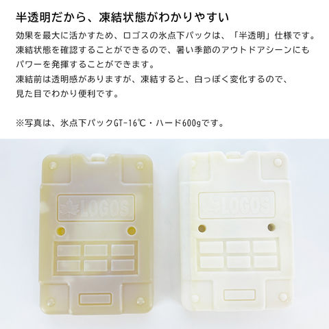 氷点下パック-16℃は、一般保冷剤に比べて保冷能力・冷却速度約8倍(ロゴス社実験)と驚異の保冷力を実現.使用前の準備としては、家庭用冷凍庫なら36~48時間ほど入れておくだけ.釣ったばかりの魚をその場で凍らせて鮮度を保つ、おしぼりを凍らせて夏場に使用するなど用途は様々.別売りの[ハイパー氷点下クーラー]との併用で、マイナス温度帯(表面温度)が長時間持続します.効果を最大に活かすため、ロゴスの氷点下パックは、容器が[半透明]仕様です.凍結状態を確認することができるので、暑い季節のアウトドアシーンにもパワーを発揮することができます.急な停電・災害時に備えとしても活躍します.表面は抗菌仕様になっているので、清潔に保てます.