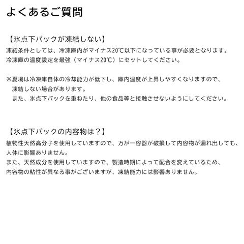 機能:氷点下パック-16℃の約半分の時間で凍結完了/一般保冷剤と併用すれば一般保冷剤がより長持ちします/冷凍庫に常備で急な停電も安心!いざという時にも庫内の冷たさを保ってくれます/植物性天然高分子の使用で安心/使いやすい半透明容器!凍結状態が一目瞭然