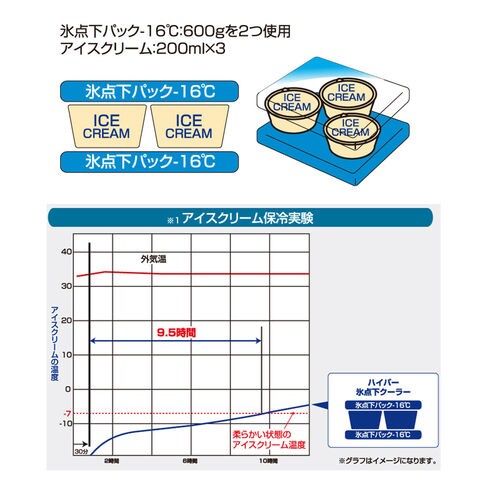 ※容量表記は目安です.※本品は氷点下パックに適切なクーラーボックスとして開発していますが、庫内温度が氷点下になるわけではありません.※アイスクリームの保冷には氷点下パックが必要です.※アイスクリームの保存時間は、ロゴス社実験データによるものです.
