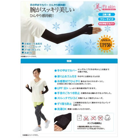 ●特長:スーパーストレッチで腕がスッキリ美しいフィットタイプ、冷感加工生地使用で、ひんやり感持続!、UVカットUPF50+、ずり落ち防止ゴム仕様、洗濯OK、手の甲までカバーで、日焼け対策ばっちり!
