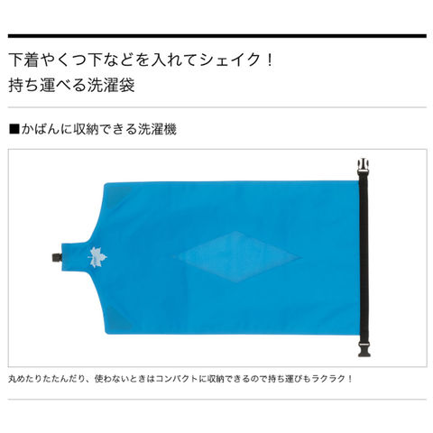 仕様:鞄に収納できる洗濯機.フィールドでも簡単に下着などを洗濯できます.下着を入れてシェイク!