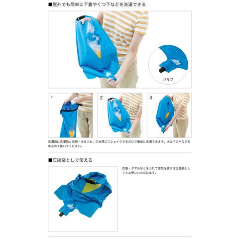 下着やくつ下などを入れてシェイク!かばんに収納できる洗濯機.フィールドでも簡単に下着などを洗濯できます.丸めたりたたんだり、使わないときはコンパクトに収納できるので持ち運びもラクラク.洗濯袋に洗濯物と洗剤・水を入れ、口を閉じてシェイクするだけで簡単に洗濯できます.水は下のバルブをゆるめて抜いてください.衣服・タオルなどを入れて空気を抜けば圧縮袋としてもお使いいただけます.