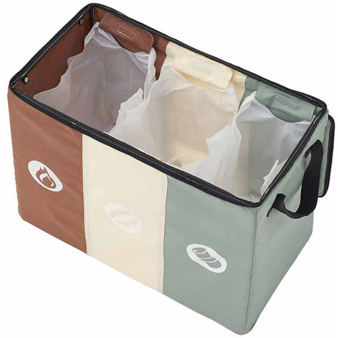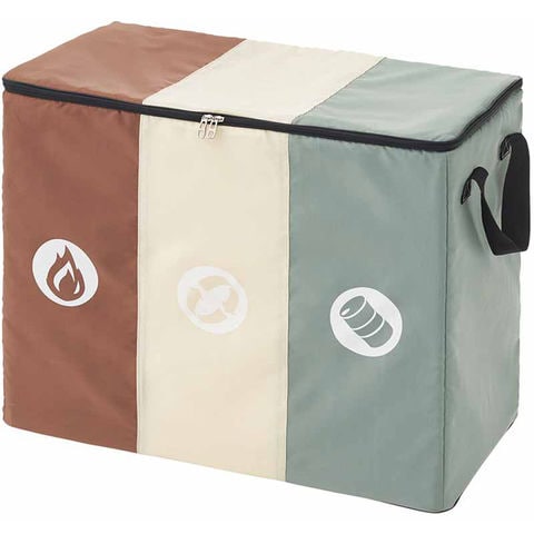 機能:3つのゴミ袋がセットできるから3種類に分別できます.蓋付きだからカラスや臭いも気にならない.グッズを入れて出発→キャンプ場でゴミ箱に変身!簡単にたためる薄型収納.