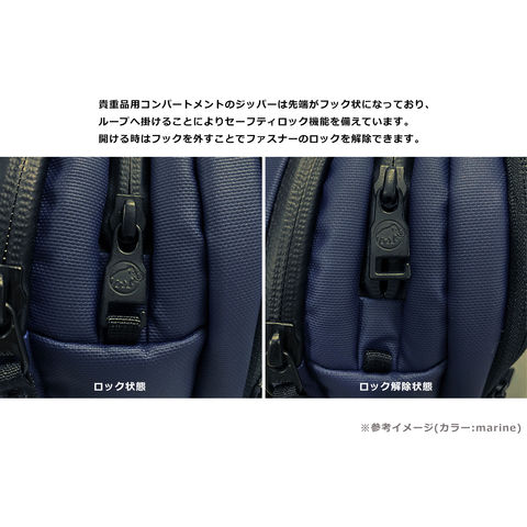 2つのハンドルと2パターンのショルダーストラップ搭載により、持ち方が選べる3WAYバッグ.マチ幅をたっぷり取った構造で、あらゆる荷物をスマートに収納できます.ノートPCやタブレット、書類などを入れてビジネスに、また着替えを入れてスポーツジム通いに、幅広く活用できます.マンモスロゴのみをポイントとした、ミニマルなデザインです.貴重品用コンパートメントのジッパーは先端がフック状になっており、ループへ掛けることによりセーフティロック機能を備えています.開ける時はフックを外すことでファスナーのロックを解除できます.
