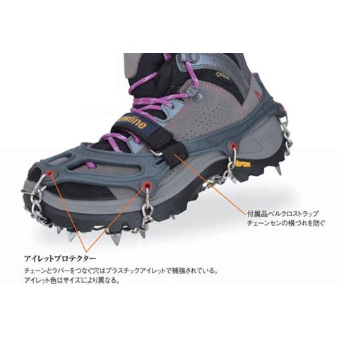 高強度ステンレス製の爪は、爪数が前8本、かかと3本(サイズSは前6本、かかと2本)あり、爪同士や爪と厚手のフィッティングラバーとの間を直径約2mmのステンレス製チェーンで接続しています.荒れた道でもチェーンが切れたり、爪が折れたり曲がったりする心配がありません.冬山のアプローチに好適です.チェーンとラバーをつなぐ穴はプラスチックアイレットで補強されています.付属の面ファスナー付きストラップはチェーンセンの横ずれを防ぎます.アイレットと同色パイピングカラーの専用防水ケース付き.