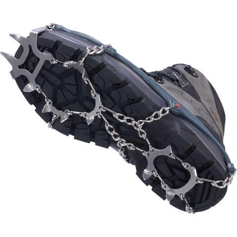 チェーンセンプロと同じ素材で合計14本の爪があります.靴底の前8本、かかかと4本の爪はしっかりと雪面へ食い込み、斜面の登行時には軸足側のつま先の2本の前爪が有効です.沢登りの草付きでの使用も可能です.アイレットと同色パイピングカラーの専用ケース付き.