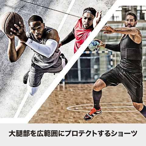仕様:大腿部の前・横・後をフルプロテクトするショーツ、大腿部のパッドは前面から後面まで包み込むワイドタイプ、hDc機能搭載 ( 劣化しない吸汗・速乾機能)、股下20cm ( Lサイズ基準)、バスケットボール公式戦使用可