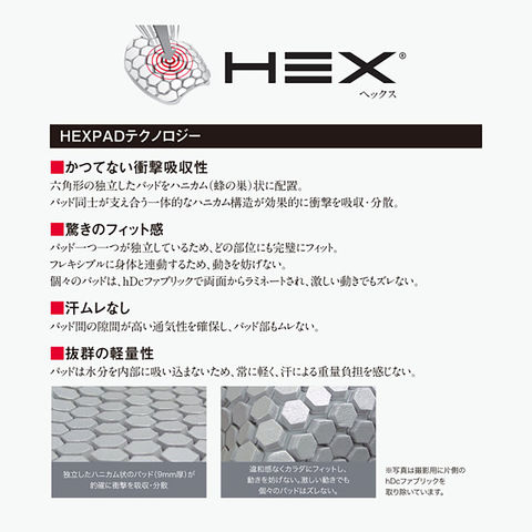特徴:HEXパッドワイドタイプ採用、コンプレッションウエア