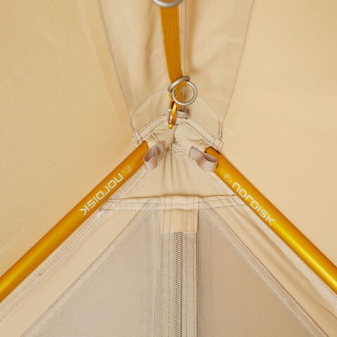 心地よいリッジテントでショートトリップへ.[カラーマイアドベンチャー]シリーズです.姉妹品の『Ydun5.5』よりは小さいですが、2人が入っても余裕のある大きさです.新機能Nordisk Turtle HubTM、Nordisk Technical Hybridファブリック両方の機能を取り入れています.メッシュの入り口と、テントの内側から開閉できる窓を開けると気持ちの良い風が入ってきます.入口は前後に2つ.このテント最大の魅力は、ポールレイアウトです.入り口は両方ともAフレームになっているため、間口を大きく広げ、テントの中からでも外の景色がよく見えます.(※ポール、ペグ、ガイロープ等のアクセサリ類は別売です.)