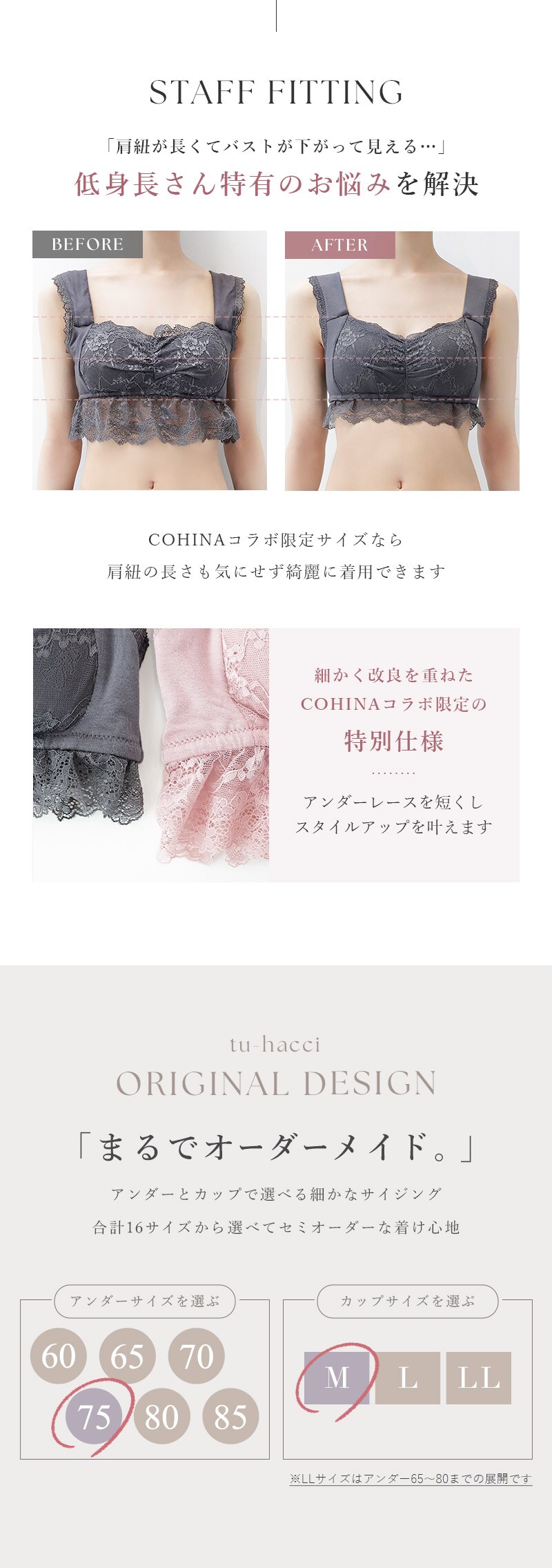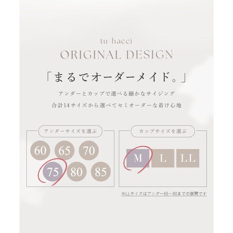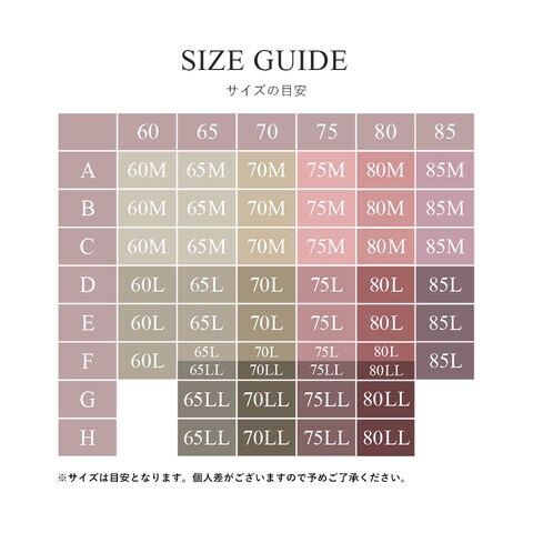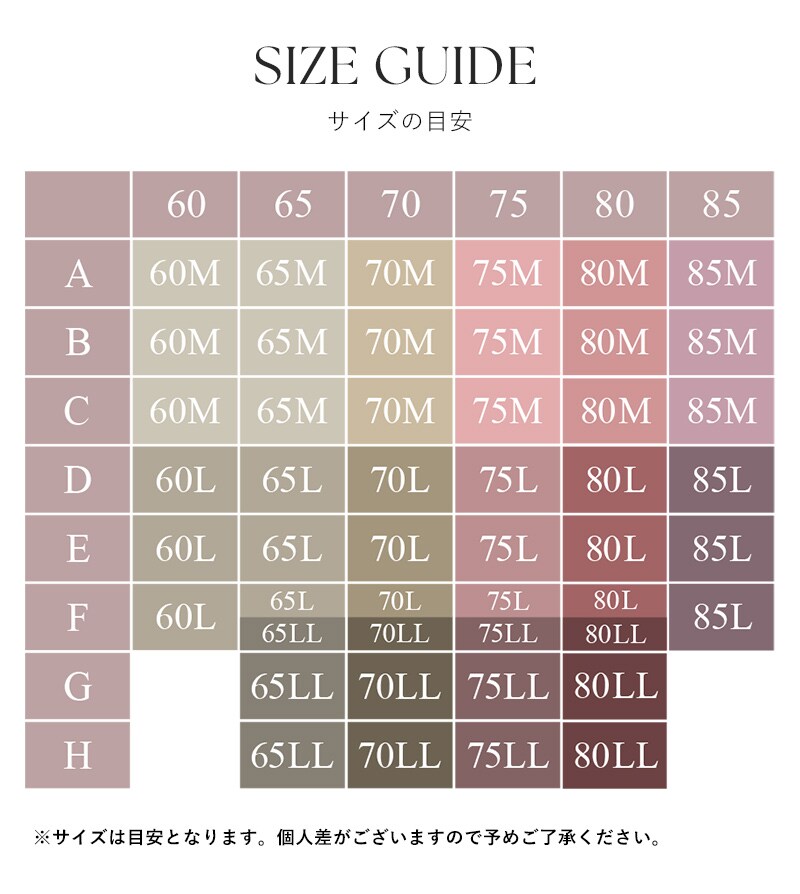 60M 60L 65M 65L 65LL 70M 70L 70LL 75M 75L 75LL 80M 80L 80LL 85M 85L ※60M/60Lはティントピンク、チャコールグレー、アイボリーのみの展開となります。 |