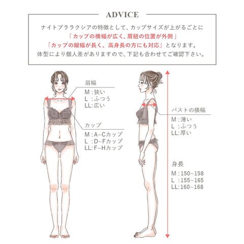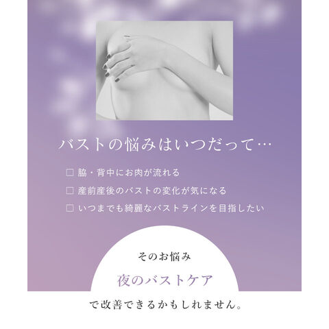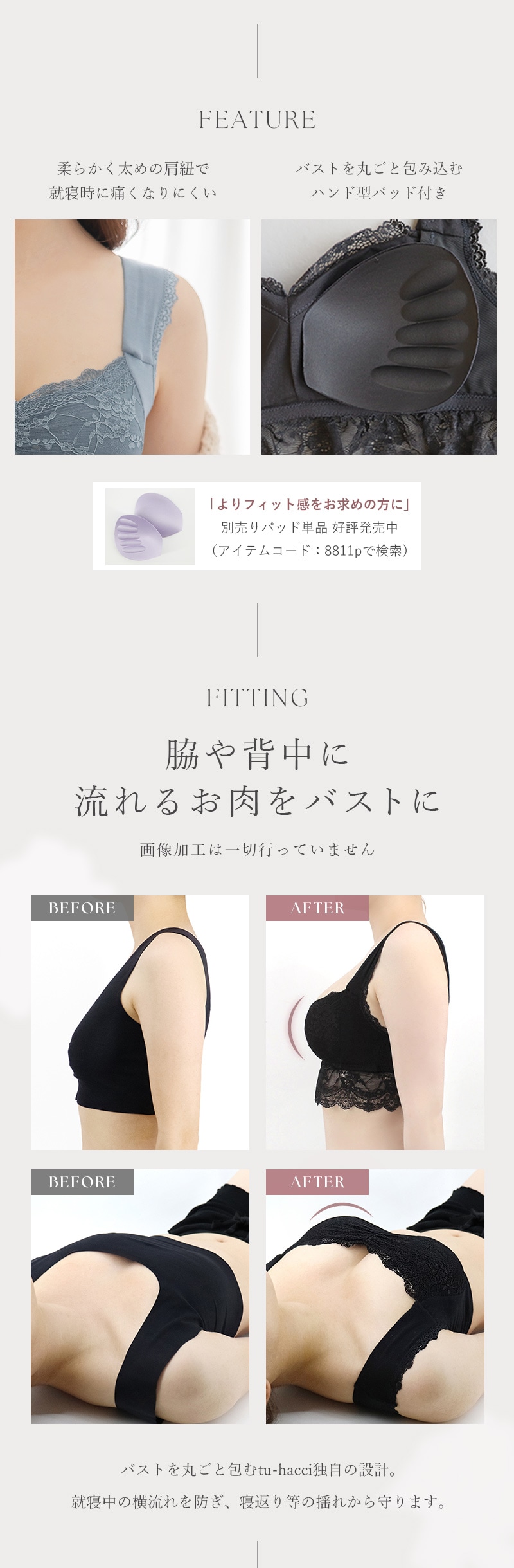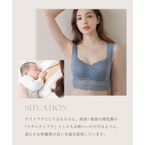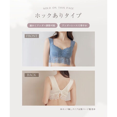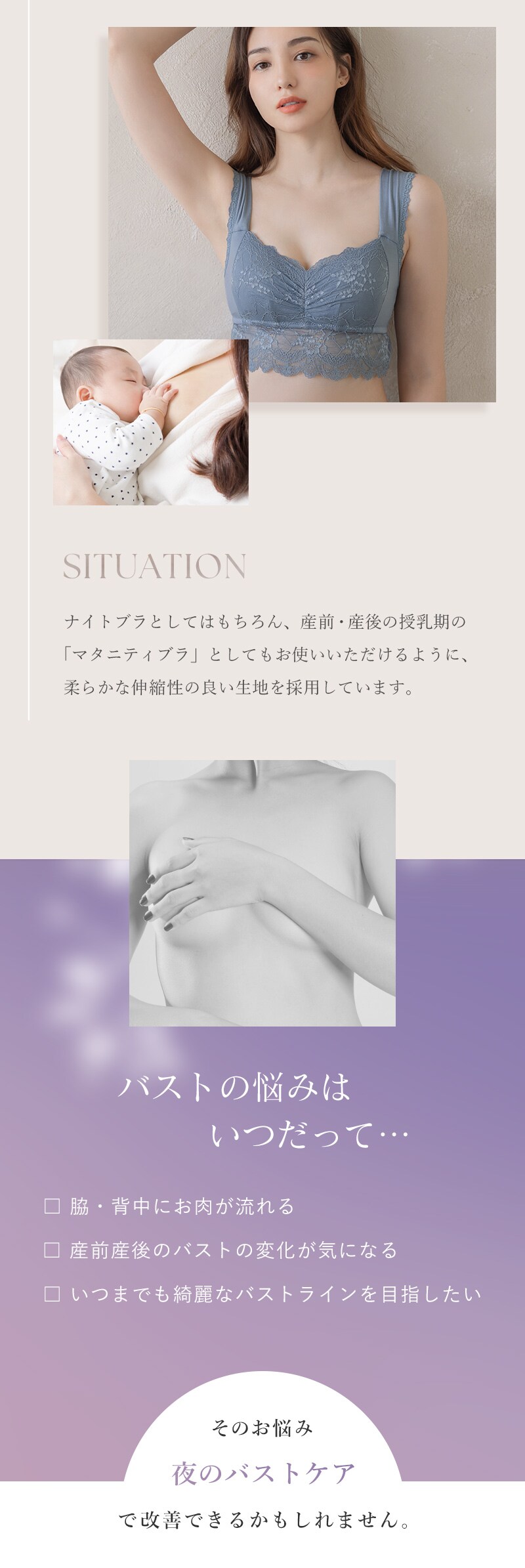 バストの横流れを予防し、理想の位置にキープ。 ノンワイヤーでもホールド力が高く、寝ている間も快適でソフトな着け心地にこだわったナイトブラ。 ナイトブラとしてはもちろん、マタニティブラや休日のリラックスブラとしてもお使いいただけます。 ■こんな方におすすめ ・バストの下垂が気になる ・脇や背中にお肉が流れる ・窮屈な下着が苦手、手軽にバストケアしたい ・フィットするナイトブラに出会えていない ・マタニティブラ、授乳ブラで垂れ防止したい ・お泊りデートに使えるかわいいナイトブラが欲しい ?産前産後にも? 縦横に伸縮するので、カップを下げての授乳も可能。 マタニティ期のデリケートなお肌にも。 マタニティフォトの衣装や出産祝いにも ■特徴 ・アンダーとカップのサイズをそれぞれ選べて、オーダーメイドなフィット感 ・カップ横にパワーネットを設置。バストの横流れを防ぎ、寝返り等の揺れから守ります ・バストを「まるごと」包み込むハンド型パッド採用 ・幅広ストラップで肩への負担を軽減。ラクな着け心地 ・工場との直接生産だからこそ実現できた価格とクオリティー \2タイプから選べます/ ・ホック&アンダーレース有りタイプ…好みや体調にあわせフィット感を調整したい方、リッチなデザインがお好きな方 ・ホック&アンダーレース無しタイプ…ホックが苦手な方や、ヘルシーなデザインがお好きな方 | |