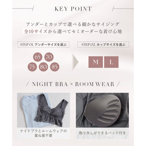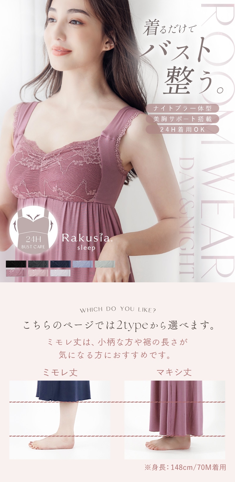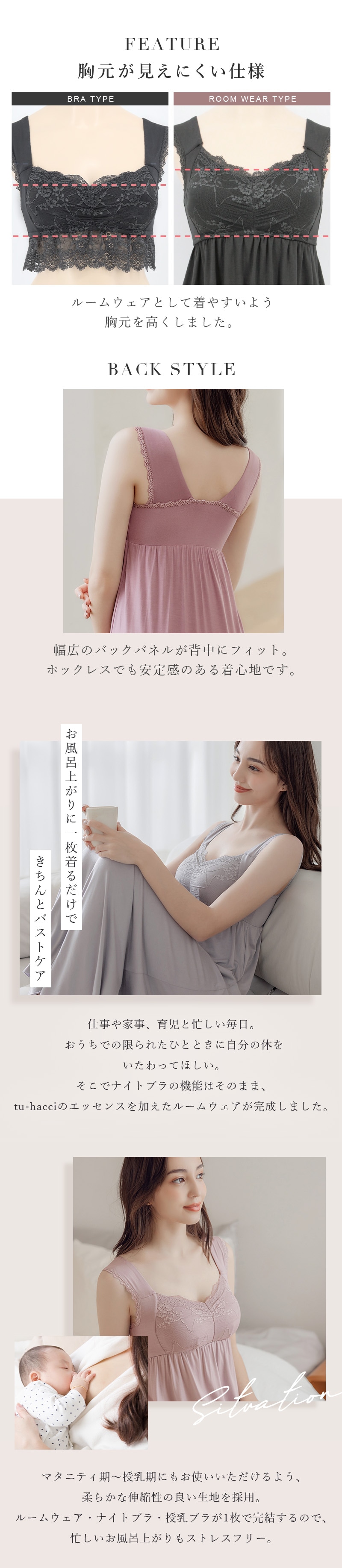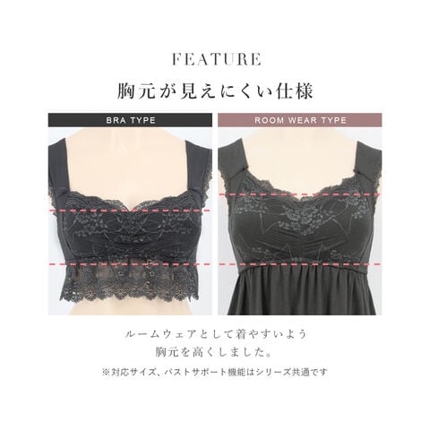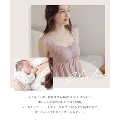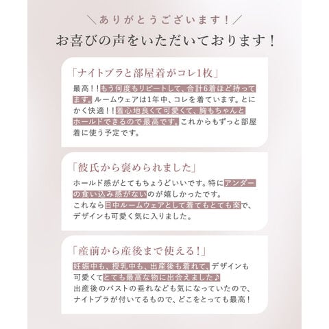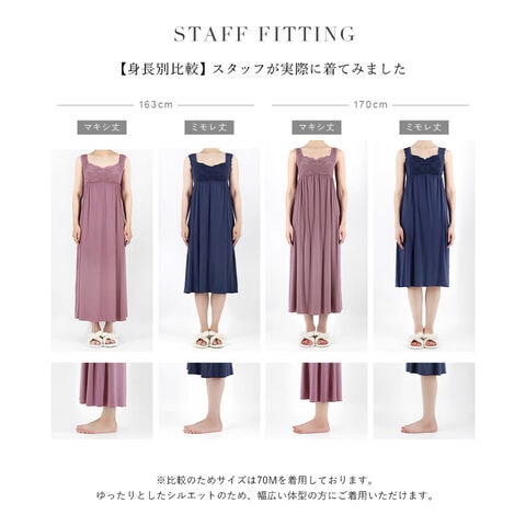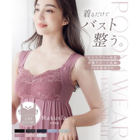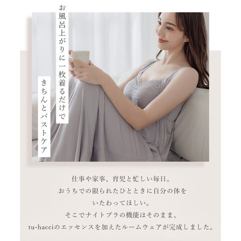バストの横流れを予防し、理想の位置にキープ。ノンワイヤーでもホールド力が高く、寝ている間も快適でソフトな着け心地にこだわったナイトブラ。 そのtu-hacciの人気No.1ナイトブラ「ラクシア」をそのまま内蔵したワンピース型ルームウェア。 上品なレースデザインはそのままに、カップ部分はやや高さを出し、谷間が見えにくい仕様に。 ブラ単体と同様、柔らかな素材のため授乳もOK。 エレガントな雰囲気たっぷりのワンピースは、胸下からふんわりと広がるAライン。お腹周りもゆったりしているため、マタニティワンピとしてもぴったりです。 ■こんな方におすすめ ・最近バストの下垂が気になる ・脇や背中にお肉が流れる ・産前産後のバストの変化が気になる ・手軽にバストケアをしたい ・窮屈な下着が苦手 ・可愛いルームウェアを探している ?授乳ブラ・マタニティブラにも? 縦横に伸縮するので、カップを下げての授乳も可能。 マタニティ期のデリケートなお肌にもご利用いただけます。 マタニティフォト用の衣装としても人気◎ ■特徴 ・カップ横にパワーネットを設置。バストの横流れを防ぎ、寝返り等の揺れから守ります。 ・バストを「まるごと」包み込むハンド型パッド採用。 ・幅広ストラップで肩への負担を軽減。ラクな着け心地。 ・工場との直接生産だからこそ実現できたこだわりの価格とクオリティー。 ・フラワーレースを贅沢に使用したリッチなデザイン。 \\好みの丈感を2タイプから選べます// ・マキシ丈タイプ…足首を覆う為、しっかり長さが欲しい方や、高身長さん向け。 ・ミモレ丈タイプ…足首まわりをスッキリさせたい方や、低身長さん向け。 | |
