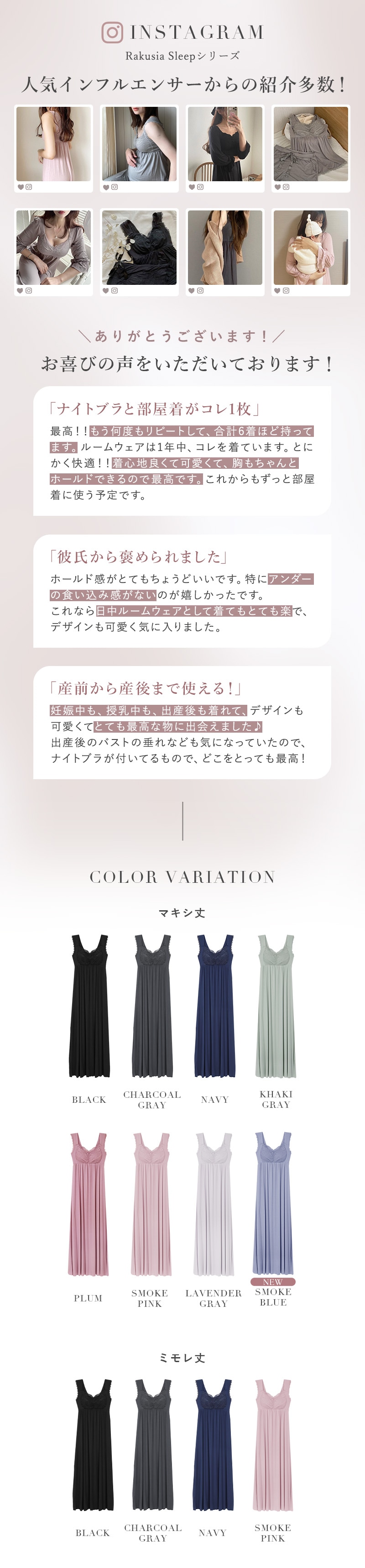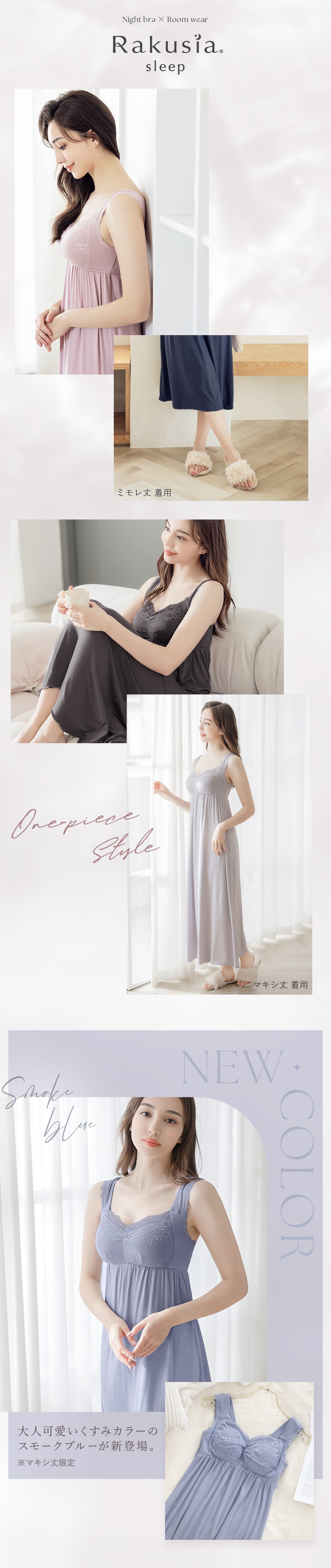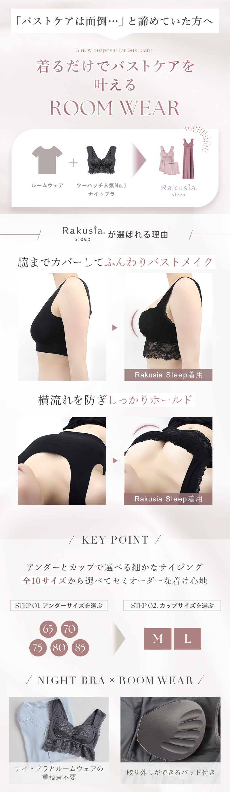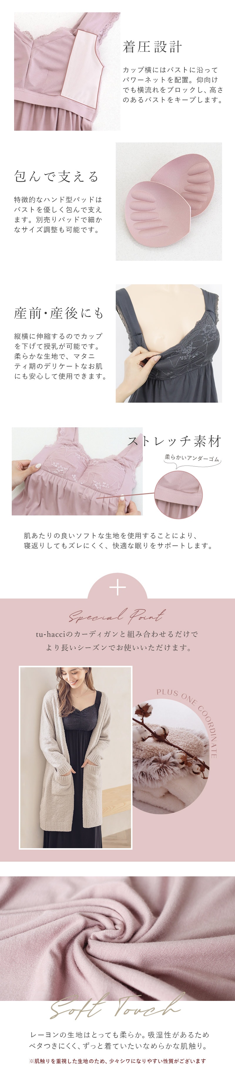 バストの横流れを予防し、理想の位置にキープ。ノンワイヤーでもホールド力が高く、寝ている間も快適でソフトな着け心地にこだわったナイトブラ。 そのtu-hacciの人気No.1ナイトブラ「ラクシア」をそのまま内蔵したワンピース型ルームウェア。 上品なレースデザインはそのままに、カップ部分はやや高さを出し、谷間が見えにくい仕様に。 ブラ単体と同様、柔らかな素材のため授乳もOK。 エレガントな雰囲気たっぷりのワンピースは、胸下からふんわりと広がるAライン。お腹周りもゆったりしているため、マタニティワンピとしてもぴったりです。 ■こんな方におすすめ ・最近バストの下垂が気になる ・脇や背中にお肉が流れる ・産前産後のバストの変化が気になる ・手軽にバストケアをしたい ・窮屈な下着が苦手 ・可愛いルームウェアを探している ?授乳ブラ・マタニティブラにも? 縦横に伸縮するので、カップを下げての授乳も可能。 マタニティ期のデリケートなお肌にもご利用いただけます。 マタニティフォト用の衣装としても人気◎ ■特徴 ・カップ横にパワーネットを設置。バストの横流れを防ぎ、寝返り等の揺れから守ります。 ・バストを「まるごと」包み込むハンド型パッド採用。 ・幅広ストラップで肩への負担を軽減。ラクな着け心地。 ・工場との直接生産だからこそ実現できたこだわりの価格とクオリティー。 ・フラワーレースを贅沢に使用したリッチなデザイン。 \\好みの丈感を2タイプから選べます// ・マキシ丈タイプ…足首を覆う為、しっかり長さが欲しい方や、高身長さん向け。 ・ミモレ丈タイプ…足首まわりをスッキリさせたい方や、低身長さん向け。 | |