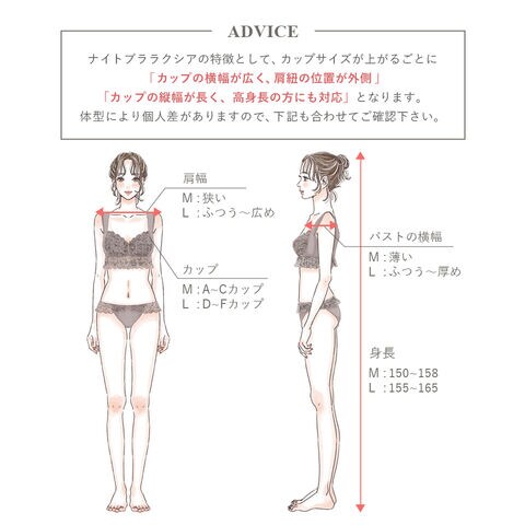 65M:A65 B65 C65 65L:D65 E65 F65 70M:A70 B70 C70 70L:D70 E70 F70 75M:A75 B75 C75 75L:D75 E75 F75 80M:A80 B80 C80 80L:D80 E80 F80 85M:A85 B85 C85 85L:D85 E85 F85 65M/アンダー小さめ:A60 B60 C60 65L/アンダー小さめ:A60 B60 C60 70M/アンダー小さめ:A65 B65 C65 70L/アンダー小さめ:D65 E65 F65 75M/アンダー小さめ:A70 B70 C70 75L/アンダー小さめ:D70 E70 F70 80M/アンダー小さめ:A75 B75 C75 80L/アンダー小さめ:D75 E75 F75 85M/アンダー小さめ:A80 B80 C80 85L/アンダー小さめ:D80 E80 F80 ※対応サイズは目安となり、実際の着用感には個人差がございます。 ※MよりLの方が、カップの横幅が広く肩紐の位置も外側になります。体型により個人差がありますので、下記も合わせてご確認下さい。 ・Mサイズ…A-Cカップの方、バストの横幅が狭い方、肩幅が狭い方 ・Lサイズ…D-Fカップの方、バストの横幅が広い方、脇肉までしっかりカバーしたい方 |