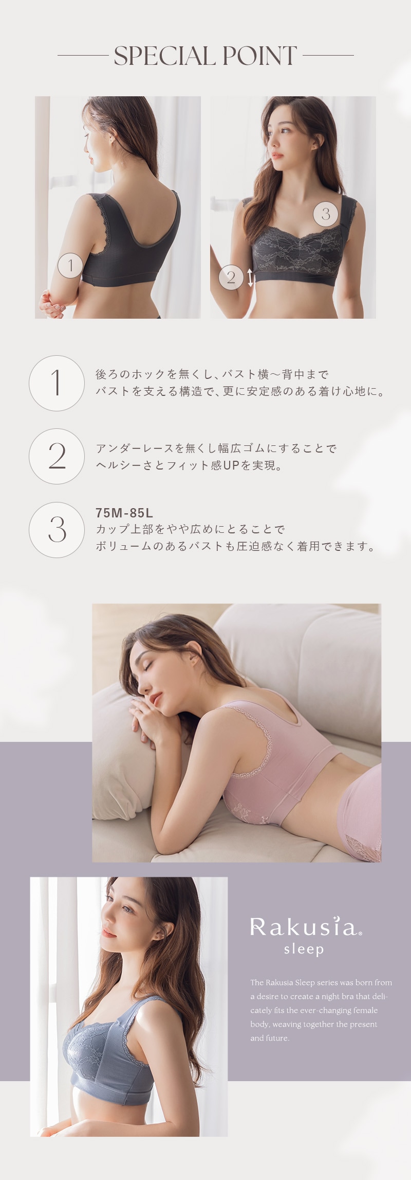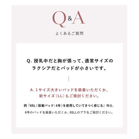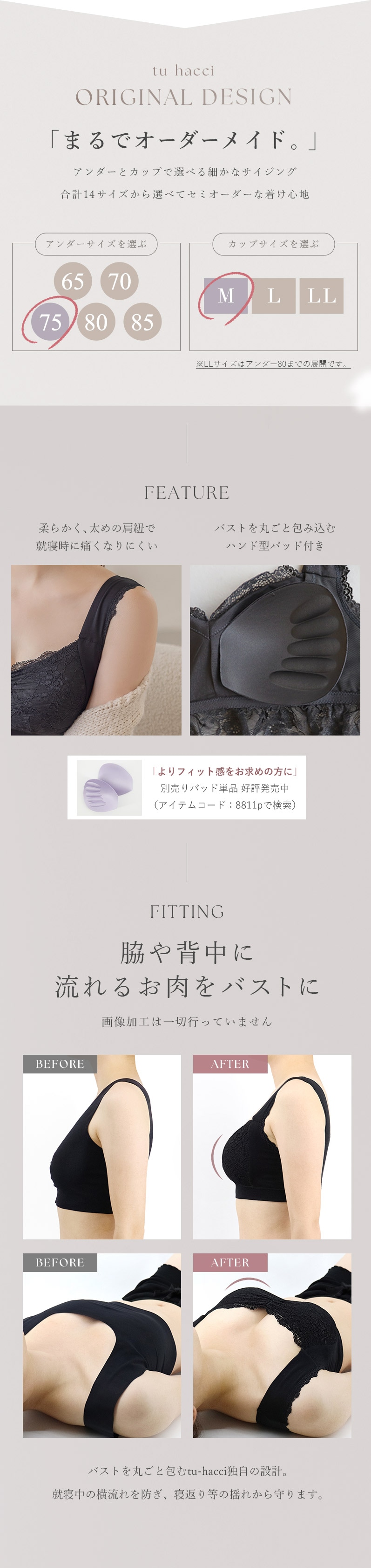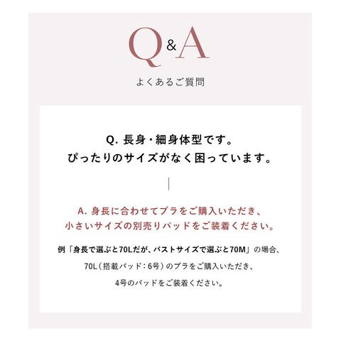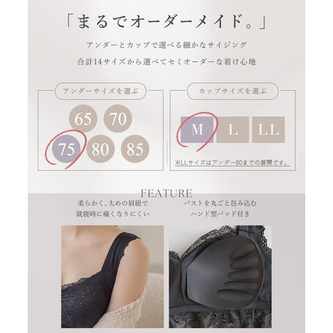 | ※ホック付きタイプと比べ、75M~85Lサイズはカップ上辺が広めの設計となっております。ぴったりとしたサイズ感をお求めの方はカップサイズをワンサイズ下げることをおすすめします。 |