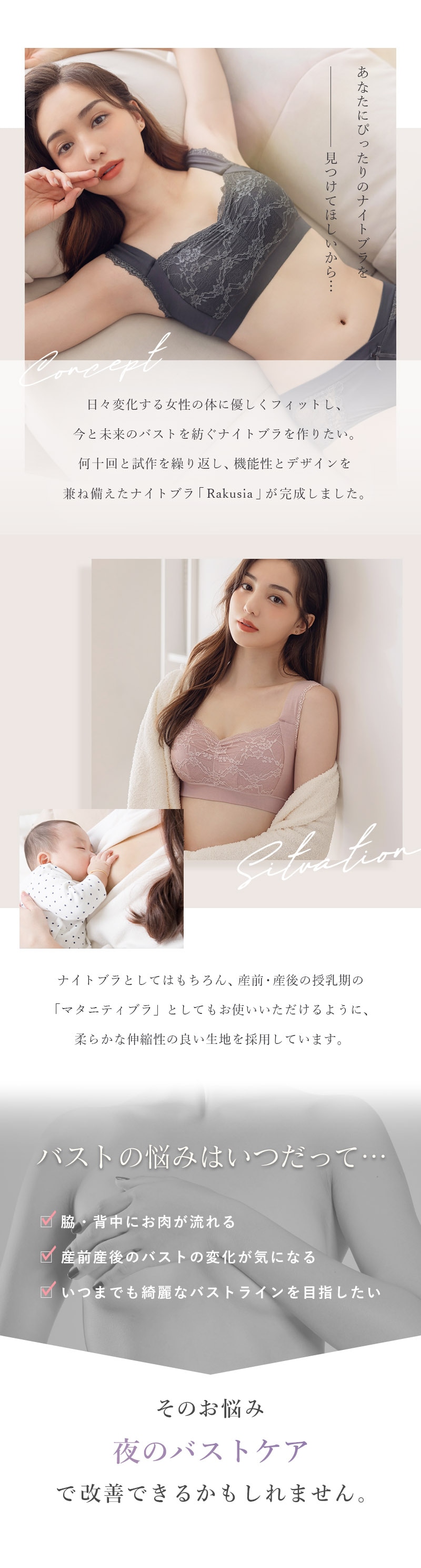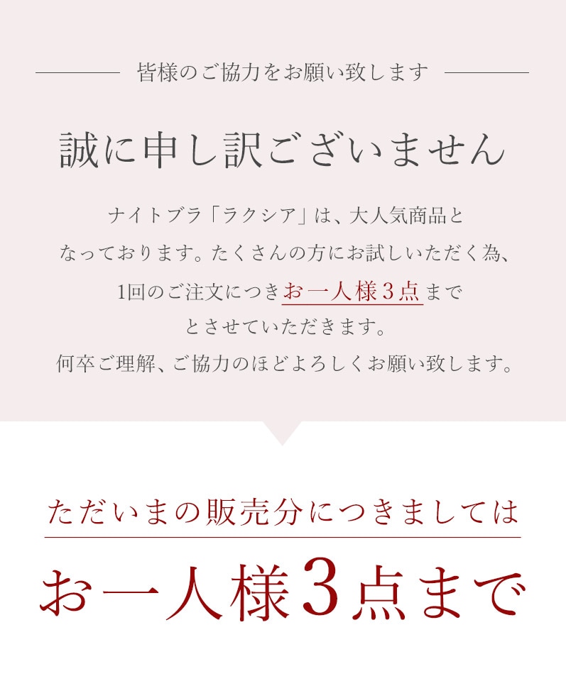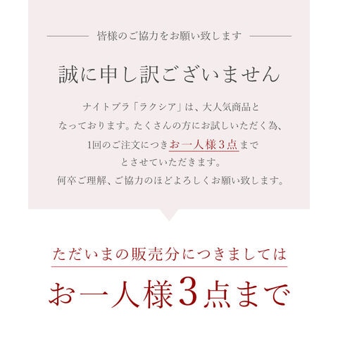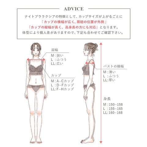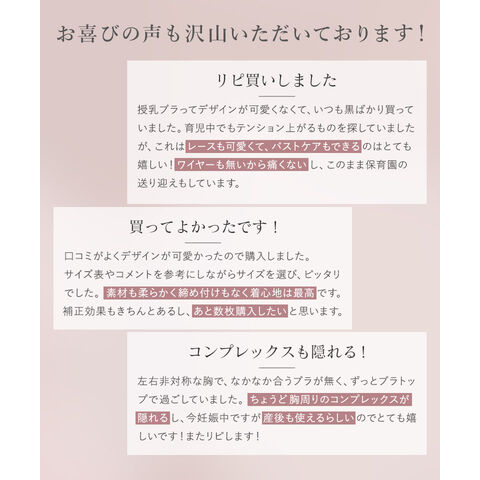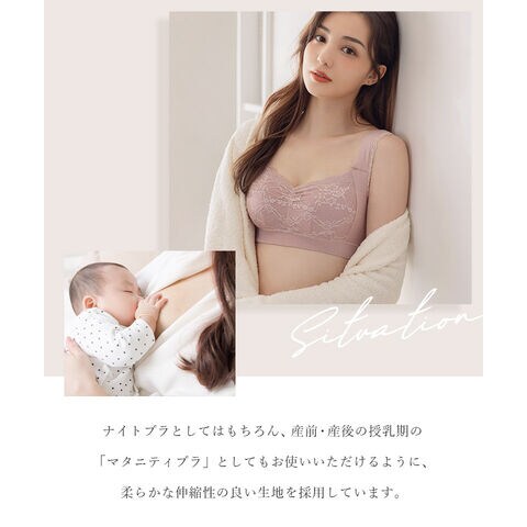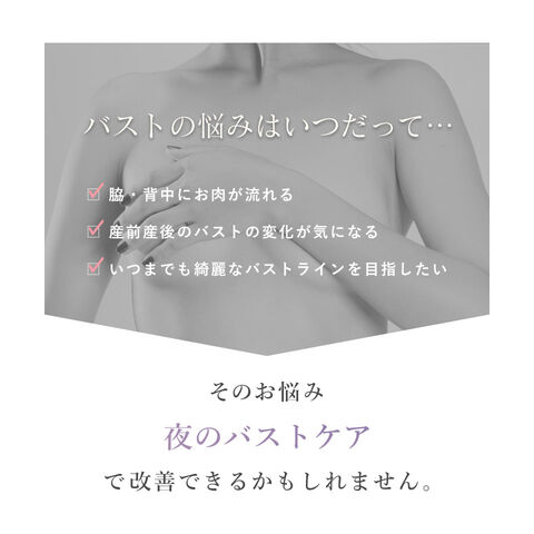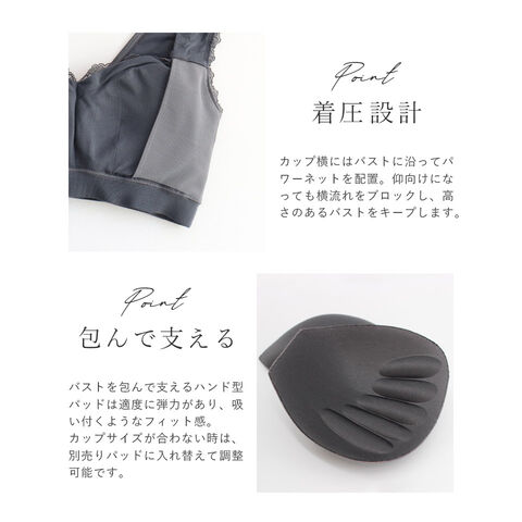バストの横流れを予防し、理想の位置にキープ。 ノンワイヤーでもホールド力が高く、寝ている間も快適でソフトな着け心地にこだわったナイトブラ。 ナイトブラとしてはもちろん、マタニティブラや休日のリラックスブラとしてもお使いいただけます。 ■こんな方におすすめ ・バストの下垂が気になる ・脇や背中にお肉が流れる ・手軽にバストケアをしたい ・フィットするナイトブラに出会えていない ・窮屈な下着が苦手 ・産前産後のバストの変化が気になる ・おしゃれなナイトブラが欲しい ~授乳ブラ・マタニティブラにも~ 縦横に伸縮するので、カップを下げての授乳も可能。 マタニティ期のデリケートなお肌にもご利用いただけます。 マタニティフォト用の衣装としても人気◎ ■特徴 ・アンダーに幅広ゴムを採用し安定感のある着け心地に ・カップ横にパワーネットを設置。バストの横流れを防ぎ、寝返り等の揺れから守ります ・バストを「まるごと」包み込むハンド型パッド採用 ・幅広ストラップで肩への負担を軽減。ラクな着け心地 ・工場との直接生産だからこそ実現できたこだわりの価格とクオリティー | |