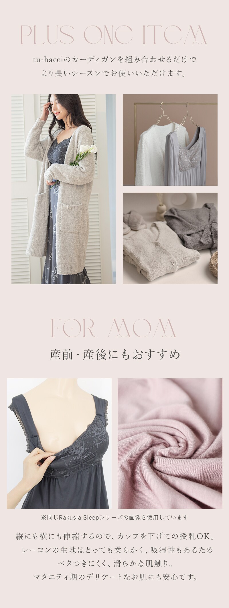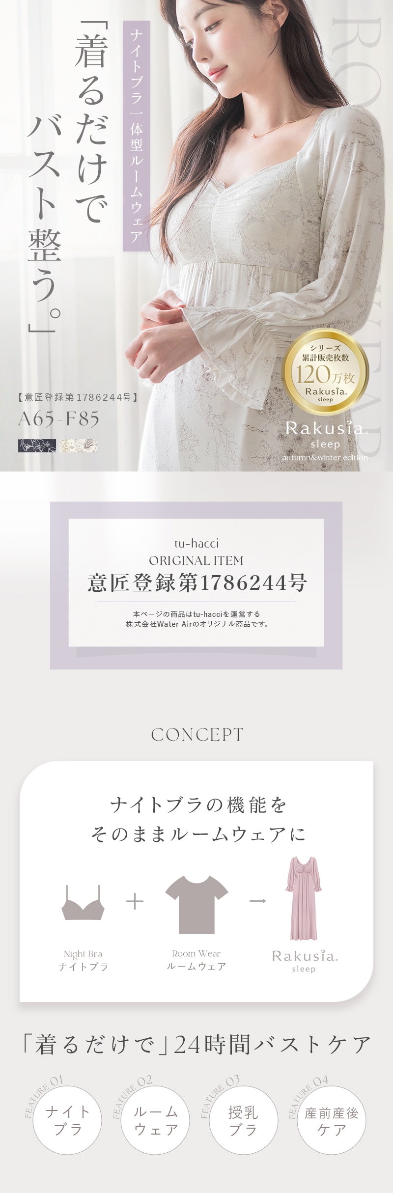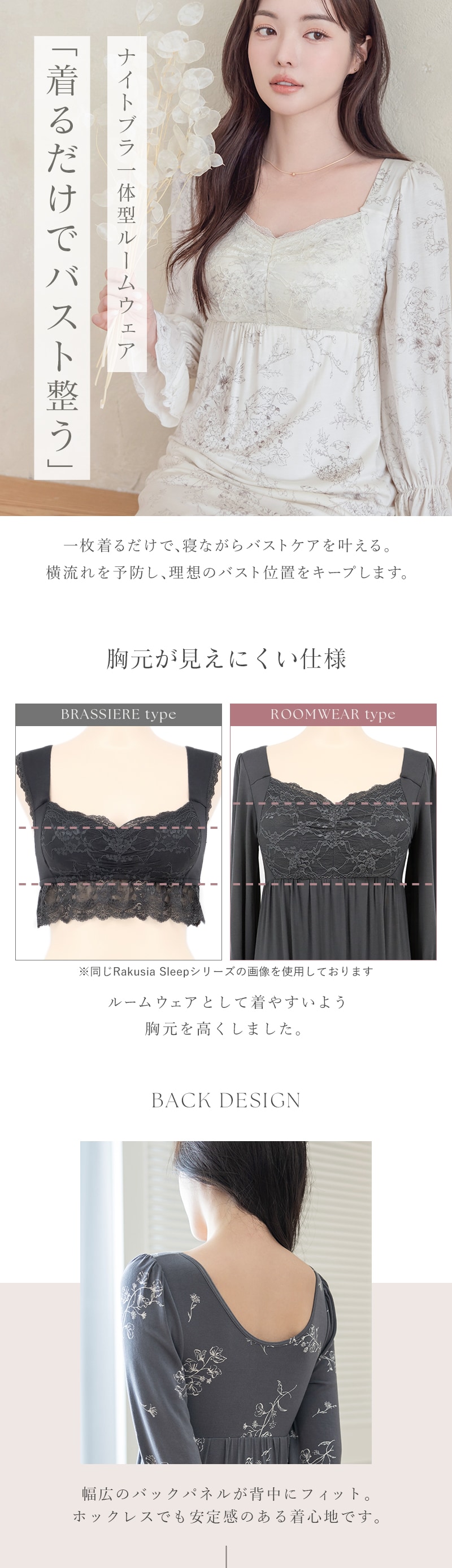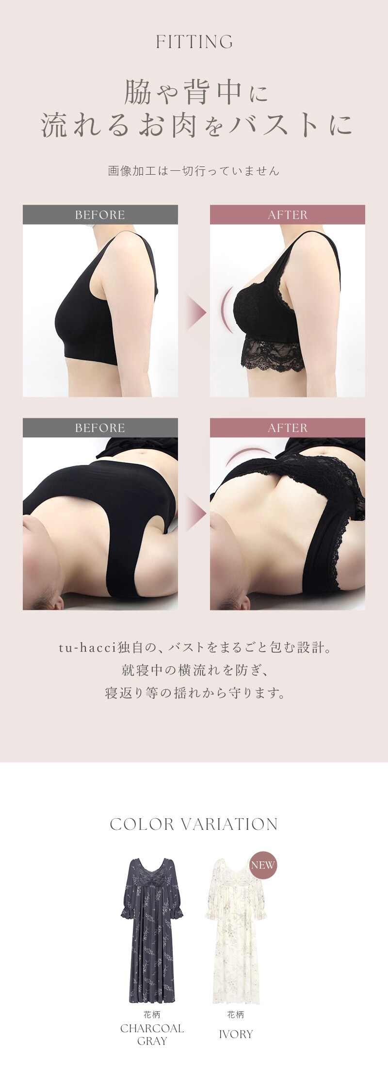 tu-hacci Nightbra Collection ナイトブラ一体型ルームウェア ~tu-hacciのナイトブラシリーズ「ラクシアスリープ」~ バストの横流れを予防し、理想の位置にキープ。ノンワイヤーでもホールド力が高く、 寝ている間も快適でソフトな着け心地にこだわったナイトブラ。 そのtu-hacciの人気No.1ナイトブラ「ラクシアスリープ」を内蔵したワンピース型ルームウェア。 上品なレースデザインはそのままに、胸元を高く谷間が見えにくい仕様に。 胸下からふんわりと広がるAラインでお腹周りもゆったりしているため、マタニティワンピとしても。 ■こんな方におすすめ ・最近バストの下垂が気になる ・脇や背中にお肉が流れる ・産前産後のバストの変化が気になる ・手軽にバストケアをしたい ・窮屈な下着が苦手 ・可愛いルームウェアを探している ~授乳ブラ・マタニティブラにも~ 縦横に伸縮するので、カップを下げての授乳も可能 マタニティ期のデリケートなお肌にもご利用いただけます マタニティフォト用の衣装としても人気◎ ■特徴 ・気になる二の腕や脇肉をカバーできるワンピース型ルームウェア長袖タイプ ・カップ横にパワーネットを設置。バストの横流れを防ぎ、寝返り等の揺れから守ります ・バストを「まるごと」包み込むハンド型パッド採用 ・フラワーレースを贅沢に使用したリッチなデザイン もこもこカーディガンを羽織ると秋冬の肌寒い季節になっても長くお使いただけます。 |