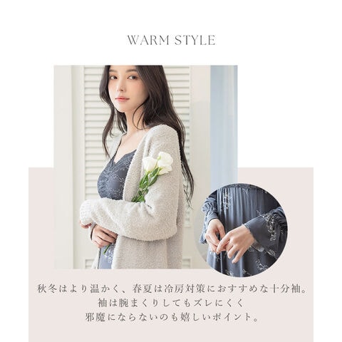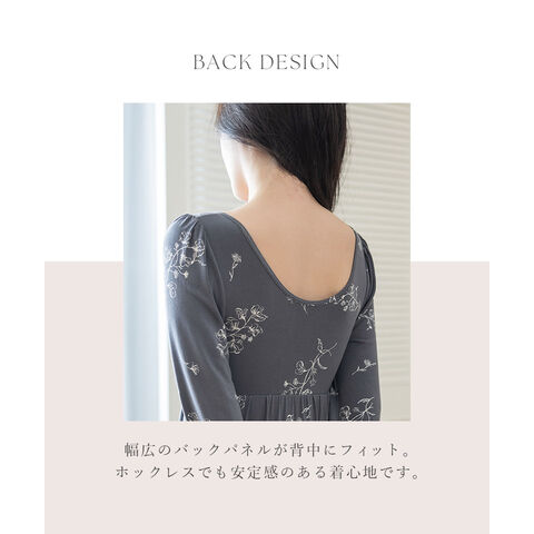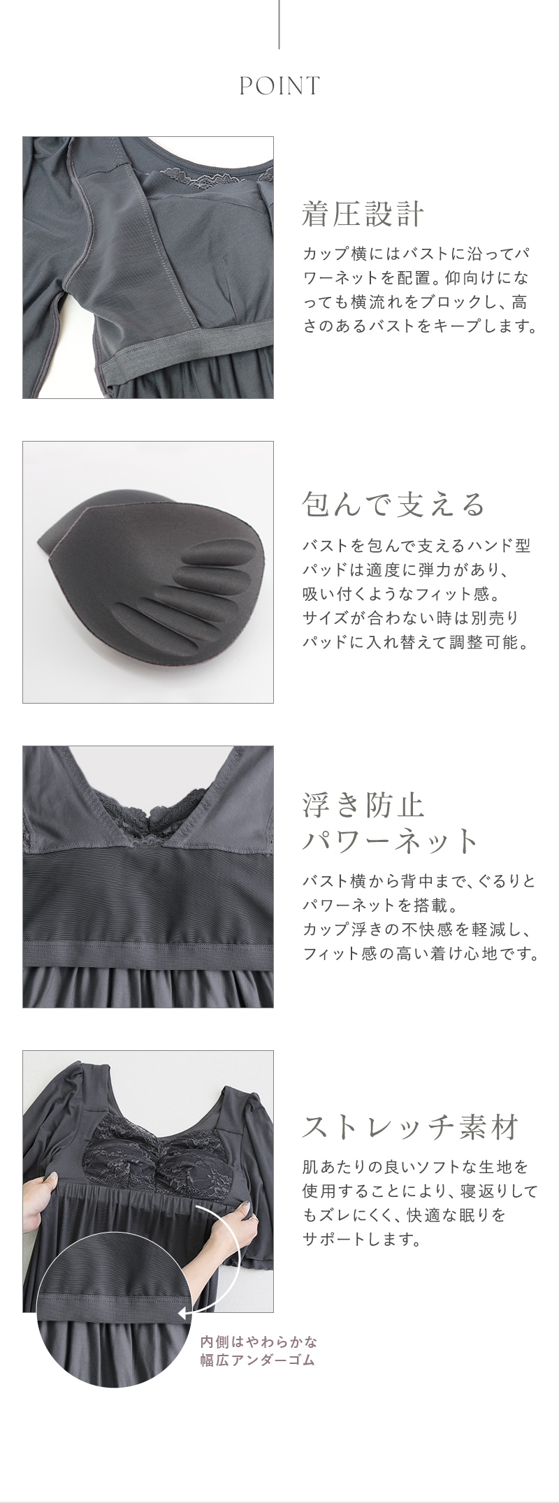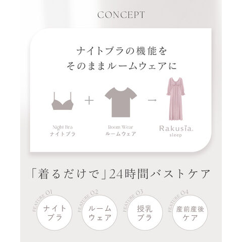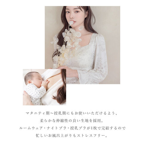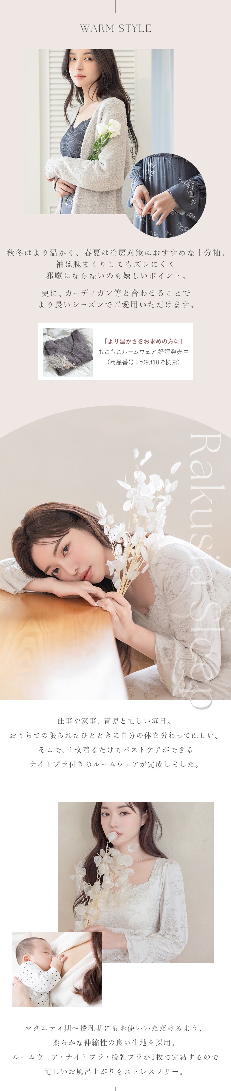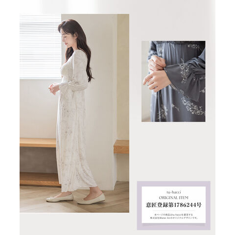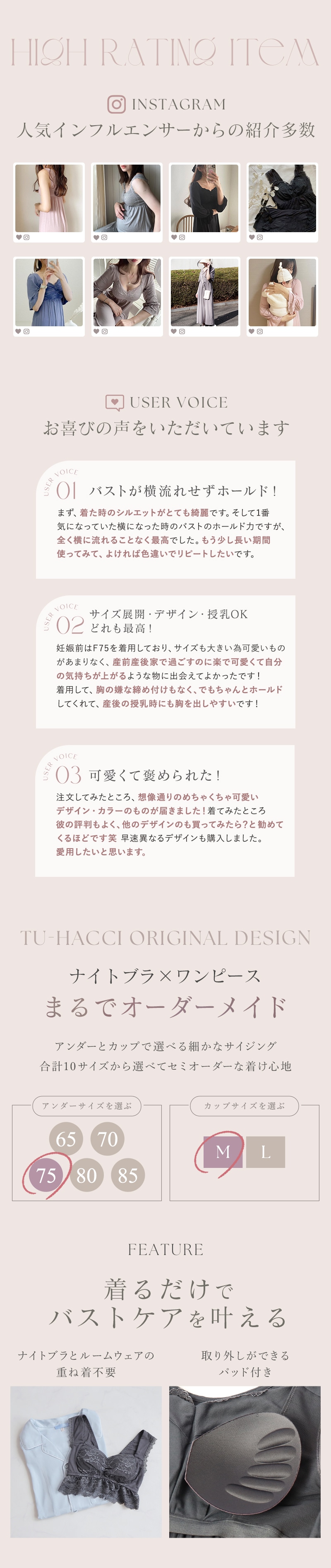 tu-hacci Nightbra Collection ナイトブラ一体型ルームウェア ~tu-hacciのナイトブラシリーズ「ラクシアスリープ」~ バストの横流れを予防し、理想の位置にキープ。ノンワイヤーでもホールド力が高く、 寝ている間も快適でソフトな着け心地にこだわったナイトブラ。 そのtu-hacciの人気No.1ナイトブラ「ラクシアスリープ」を内蔵したワンピース型ルームウェア。 上品なレースデザインはそのままに、胸元を高く谷間が見えにくい仕様に。 胸下からふんわりと広がるAラインでお腹周りもゆったりしているため、マタニティワンピとしても。 ■こんな方におすすめ ・最近バストの下垂が気になる ・脇や背中にお肉が流れる ・産前産後のバストの変化が気になる ・手軽にバストケアをしたい ・窮屈な下着が苦手 ・可愛いルームウェアを探している ~授乳ブラ・マタニティブラにも~ 縦横に伸縮するので、カップを下げての授乳も可能 マタニティ期のデリケートなお肌にもご利用いただけます マタニティフォト用の衣装としても人気◎ ■特徴 ・気になる二の腕や脇肉をカバーできるワンピース型ルームウェア長袖タイプ ・カップ横にパワーネットを設置。バストの横流れを防ぎ、寝返り等の揺れから守ります ・バストを「まるごと」包み込むハンド型パッド採用 ・フラワーレースを贅沢に使用したリッチなデザイン もこもこカーディガンを羽織ると秋冬の肌寒い季節になっても長くお使いただけます。 |