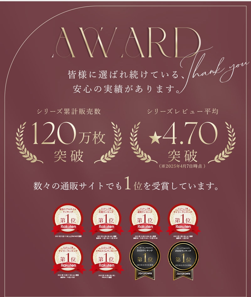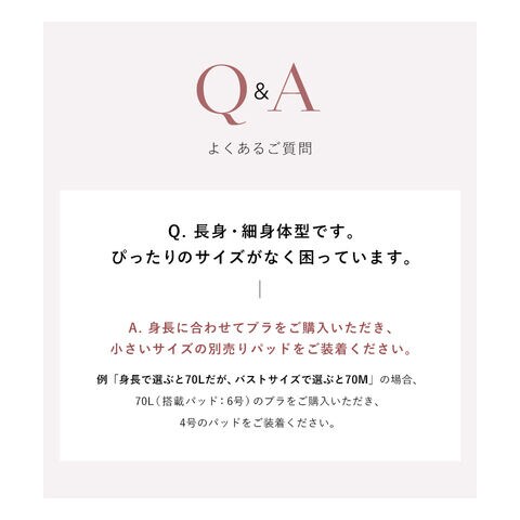 ※常に商品改良を行っており、ご購入いただくタイミングにより仕様や着用感が若干異なる場合がございます。 ※届いた商品のアンダーがきついと感じられた場合 製造の過程でまれに内部にしつけ糸が残っている場合がございます。 その場合は、両手でアンダー部分を引き伸ばしてからご着用下さい。 ブチブチとしつけ糸が切れる音がしますが仮縫いの糸のため品質には問題ございません。 |