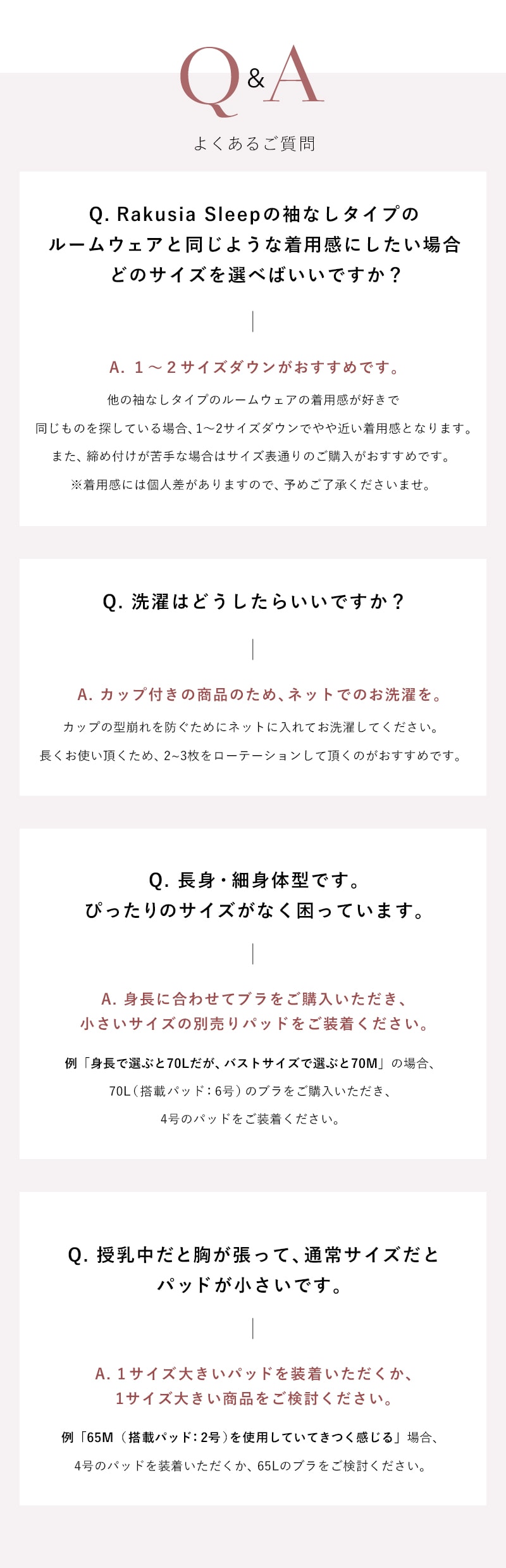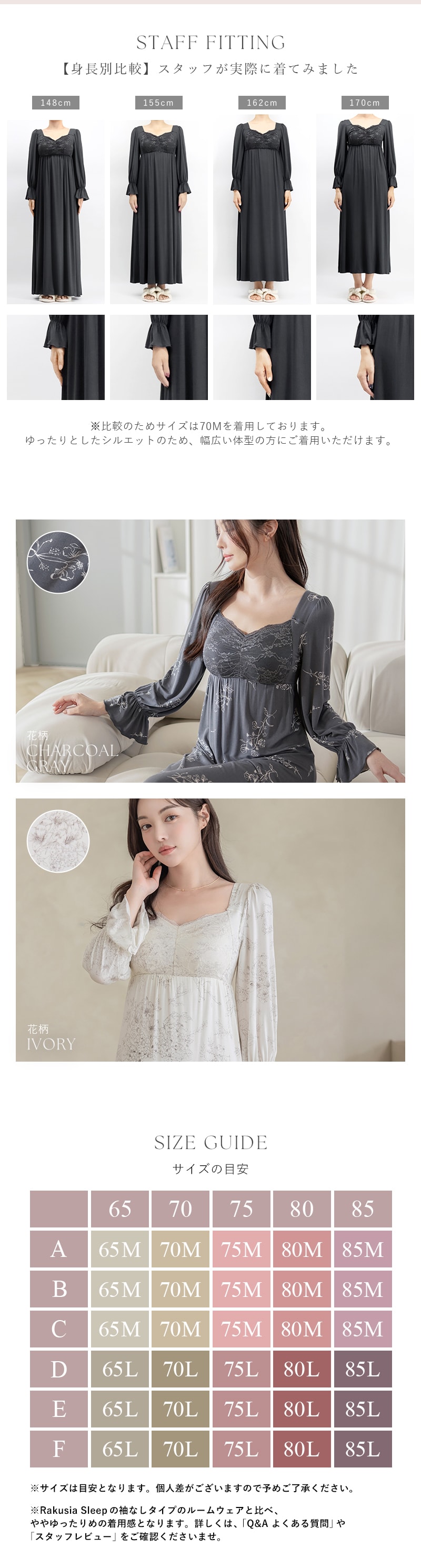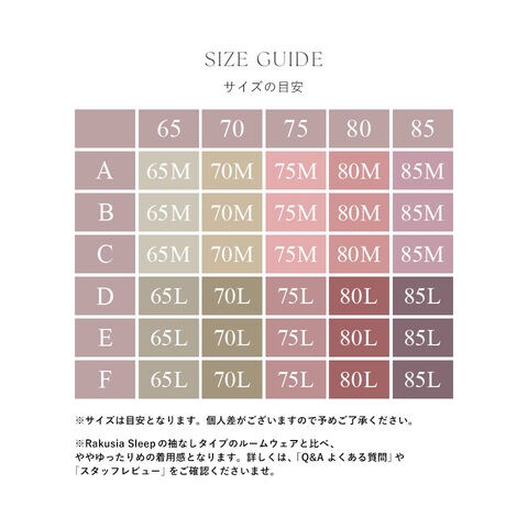65M:A65 B65 C65 65L:D65 E65 F65 70M:A70 B70 C70 70L:D70 E70 F70 75M:A75 B75 C75 75L:D75 E75 F75 80M:A80 B80 C80 80L:D80 E80 F80 85M:A85 B85 C85 85L:D85 E85 F85 ※対応サイズは目安となります。個人差がございますので予めご了承ください。 ※Rakushia Sleepの袖なしタイプルームウェアに比べ、ややゆったりめの着用感となります。画像の「Q&A よくある質問」や「スタッフレビュー」をご確認ください。 |