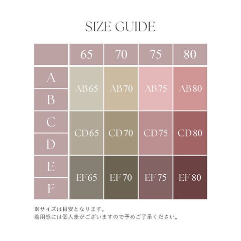 | 【AB65】A65/B65 【AB70】A70/B70 【AB75】A75/B75 【AB80】A80/B80 【CD65】C65/D65 【CD70】C70/D70 【CD75】C75/D75 【CD80】C80/D80 【EF65】E65/F65 【EF70】E70/F70 【EF75】E75/F75 【EF80】E80/F80 ※サイズは目安となります。 実際の着用感には個人差がございますので、 予めご了承いただけますようお願い申し上げます。 |