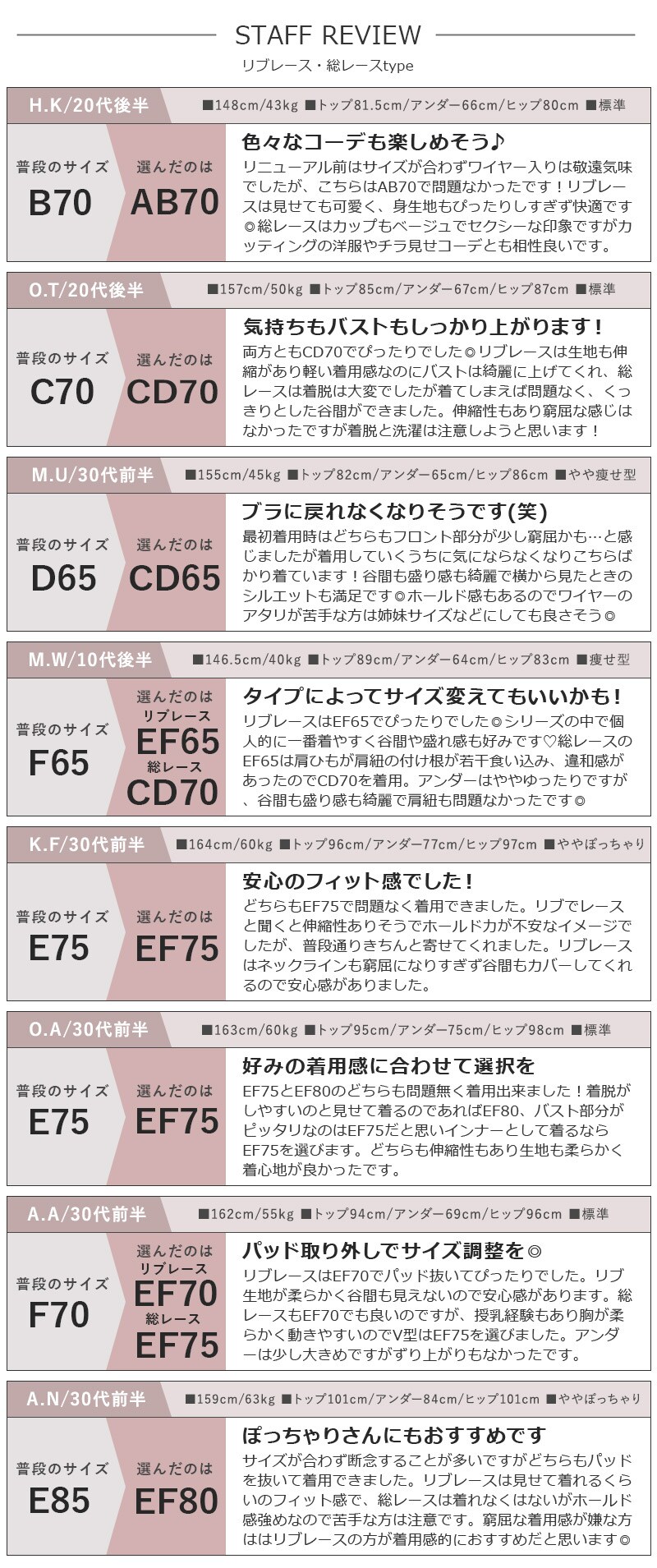 | 【AB65】A65/B65 【AB70】A70/B70 【AB75】A75/B75 【AB80】A80/B80 【CD65】C65/D65 【CD70】C70/D70 【CD75】C75/D75 【CD80】C80/D80 【EF65】E65/F65 【EF70】E70/F70 【EF75】E75/F75 【EF80】E80/F80 ※サイズは目安となります。 実際の着用感には個人差がございますので、 予めご了承いただけますようお願い申し上げます。 |
