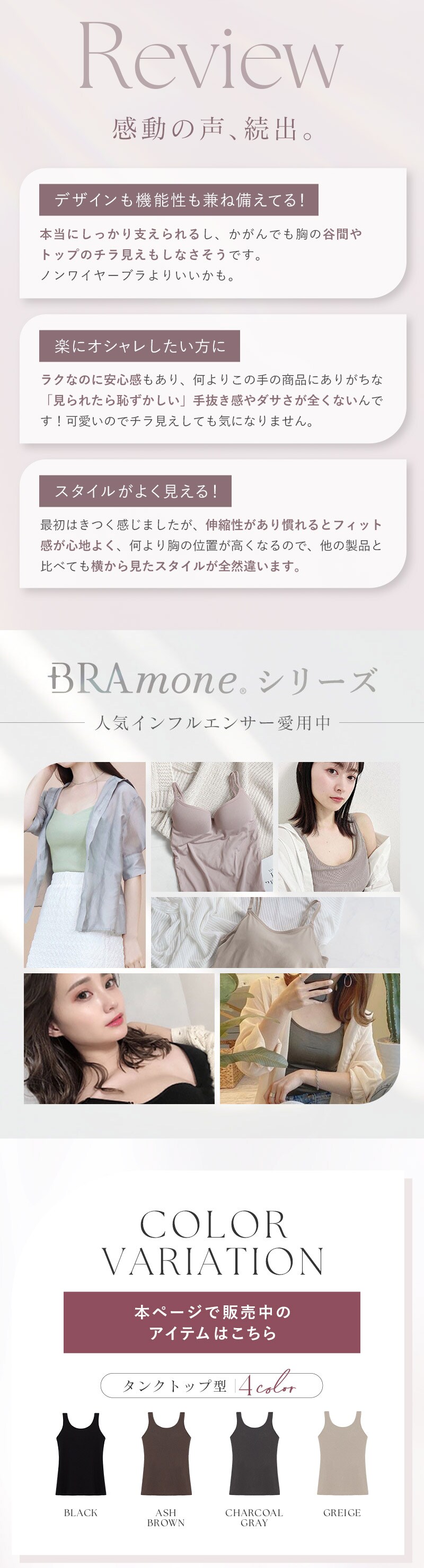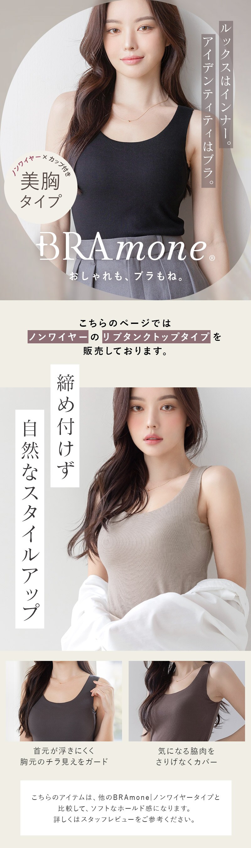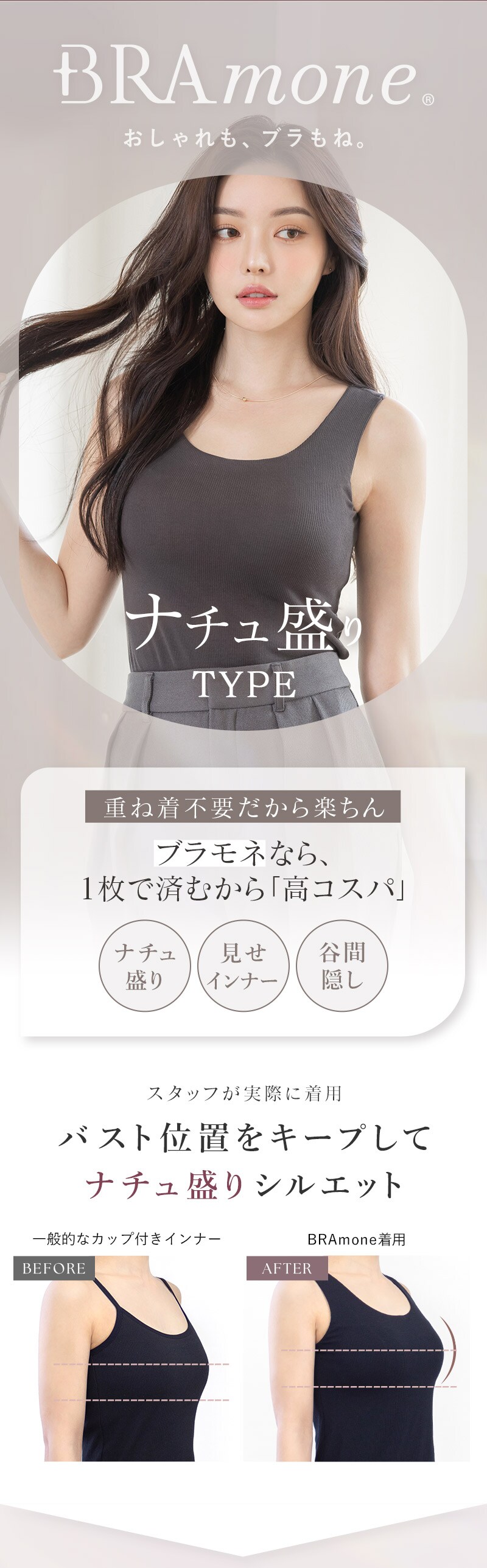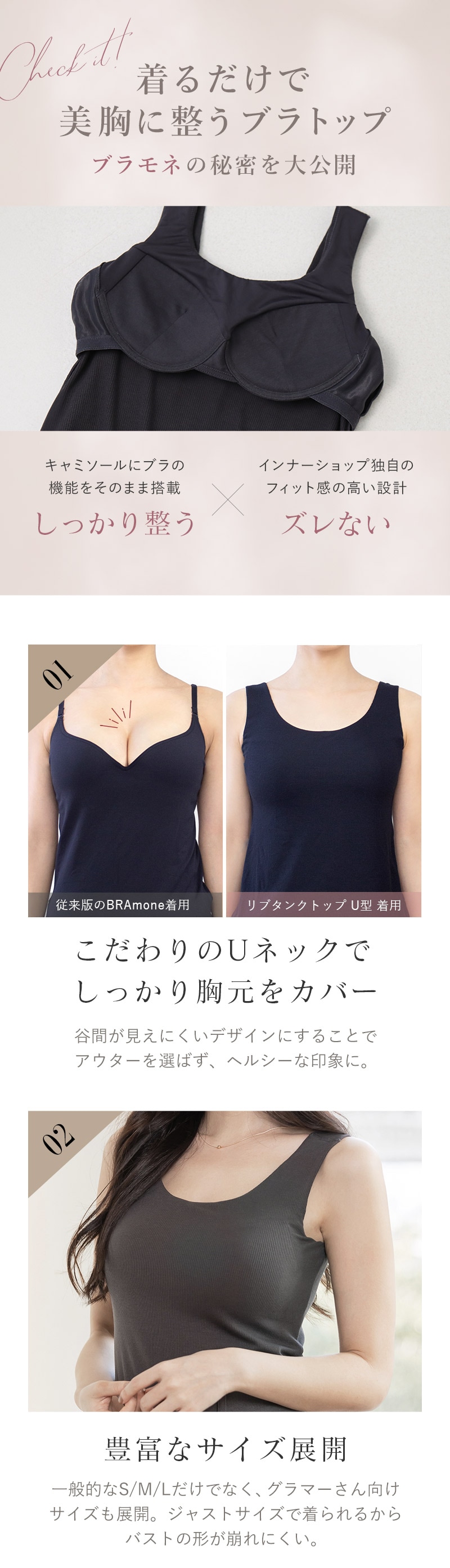 tu-hacci Inner Collection ブラキャミ単品 ~楽盛りインナーBRAmone(ブラモネ)シリーズ~ tu-hacciの人気No.1インナー。ブラ一体型で下着+インナーの重ね着のわずらわしさから解放。 リブ素材で1枚で見せて着用できるので、コーディネートの幅が広がります。 インナーショップならではのノウハウを生かし、ワイヤレスでも自然な美胸メイクを叶えるカップを独自に開発。 「ナチュラルな盛り感が好き」「胸元や脇肉をカバーしたい」「カップが浮きやすくフィット感がほしい」方におすすめのシリーズです。 ■ワイヤレスでも「フィット◎」「美胸◎」 よりリラクシーな着け心地が特徴のノンワイヤータイプ。 締め付けず、自然にスタイルアップを叶える機能が満載。 【商品の特徴】 ・薄手の下厚パッドで自然なバストメイク ・首元が浮きにくく胸元のチラ見えをカバー ・見せて着られる綿混のリブ素材でコーディネートに取り入れやすい ・アンダーゴムは食い込みを軽減する平ゴムを採用 ・スムース生地で程よいホールド力とソフトな着用感を両立 【こんな方におすすめ】 ・ノンワイヤー派だけどバストの形が崩れるのが心配 ・窮屈な下着、ワイヤーの締め付けが苦手 ・バストボリュームが少なくカップ上部がパカパカしやすい ・自然な盛り感でバストをきれいに見せたい ・谷間や脇肉をさりげなく隠したい ・大きいサイズのカップ付きインナーが欲しい ・シアートップスやカーディガンに合わせるインナーに悩む 【こんな時におすすめです】 ・普段のインナーとして ・コーディネートに取り入れて ・おうち時間でのリラックスウェアとして ※こちらの商品は就寝中、ナイトブラとしてのご着用も可能です。 バストの横流れ防止など、より就寝中に特化した補正機能をお求めの方は、ナイトブラカテゴリ商品のご着用をおすすめいたします。 ※サイズは目安となり、着用感には個人差がございます。 ※バストの脂肪が少ない方でも、カップに隙間ができにくい仕様です。 ※バストにハリがある方やFカップの方は谷間が目立つことがあるため、気になる場合は1サイズ上をお選びください。 |
