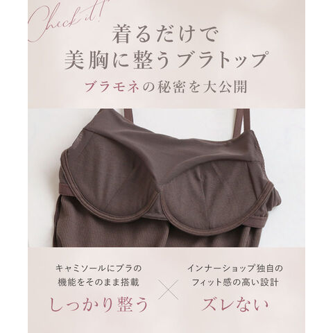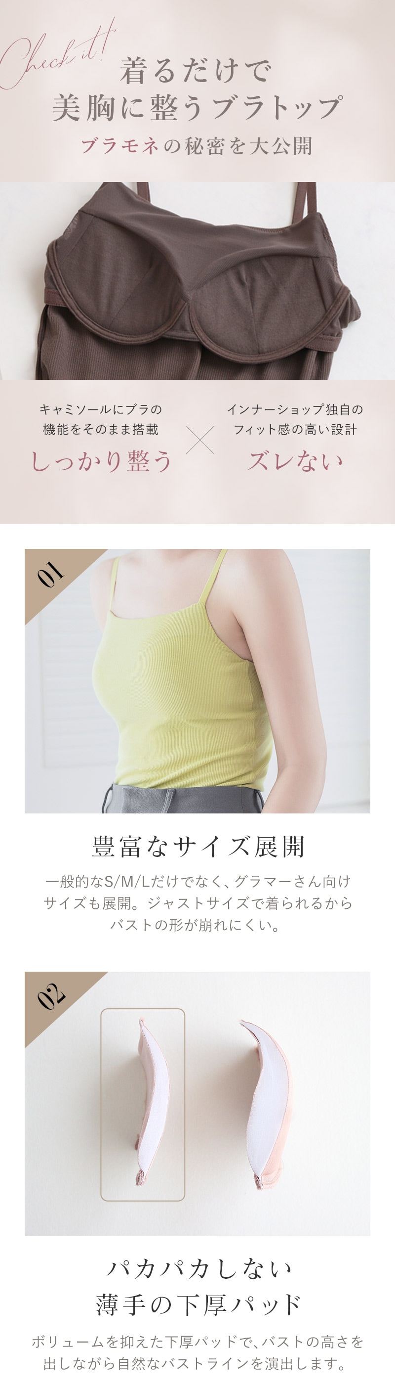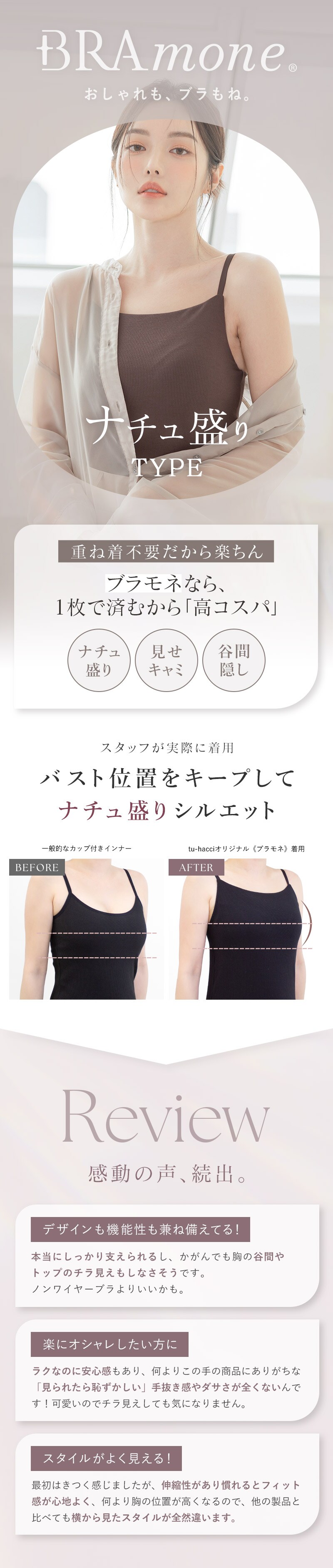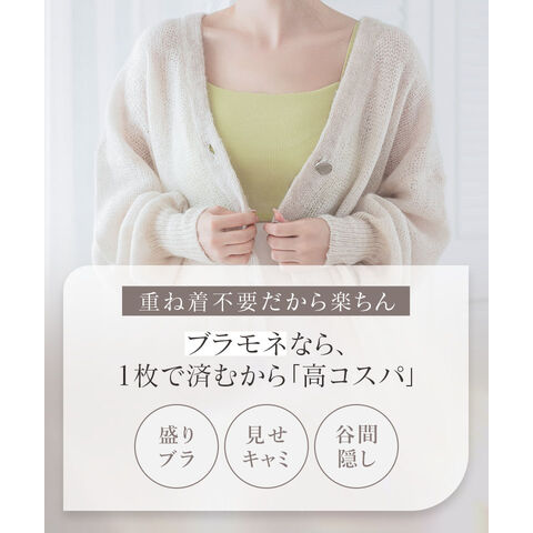 tu-hacci Inner Collection ブラキャミ単品 ~楽盛りインナーBRAmone(ブラモネ)シリーズ~ ブラ一体型で、下着+インナーの重ね着のわずらわしさから解放。 リブ素材で1枚で見せて着用できるので、コーディネートの幅が広がります。 インナーショップならではのノウハウを生かし、ワイヤレスでも自然な美胸メイクを叶えるカップを独自に開発。 「ナチュラルな盛り感が好き」「胸元や脇肉をカバーしたい」「カップが浮きやすくフィット感がほしい」方におすすめです。 ■ワイヤレスでも「フィット◎」「美胸◎」 よりリラクシーな着け心地が特徴のノンワイヤータイプ。 締め付けず、自然にスタイルアップを叶える機能が満載。 日中からおうち時間まで幅広いシーンで活躍。 【商品の特徴】 ・薄手の下厚パッドで自然なバストメイク ・首元が浮きにくく胸元のチラ見えをカバー ・見せて着られる綿混のリブ素材でコーディネートに取り入れやすい ・アンダーゴムは食い込みを軽減する平ゴムを採用 ・スムース生地で程よいホールド力とソフトな着用感を両立 【こんな方におすすめ】 ・シアートップスやカーディガンに合わせるインナーに悩む ・谷間や脇肉を隠したい ・ノンワイヤー派だけどバストの形が崩れるのが心配 ・バストボリュームが少なくカップ上部がパカパカしやすい 【こんな時におすすめです】 ・普段のインナーとして ・コーディネートに取り入れて ・おうち時間でのリラックスウェアとして ※こちらの商品は就寝中、ナイトブラとしてのご着用も可能です。 バストの横流れ防止など、より就寝中に特化した補正機能をお求めの方は、「ナイトブラカテゴリ商品」のご着用をおすすめいたします。 ※エクリュは、カップの裏の配色をリニューアルし、透けにくさを向上させました。 さらに、透けにくい厚い生地を採用することで、より透けにくい仕様となっています。 |
