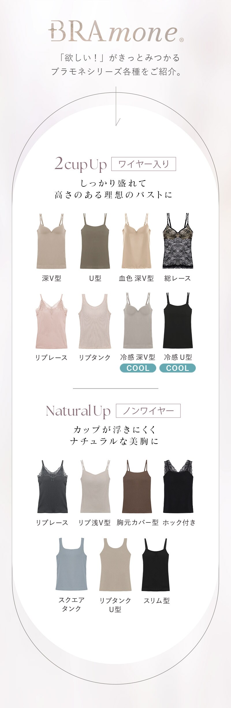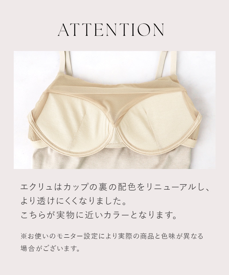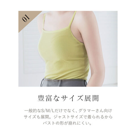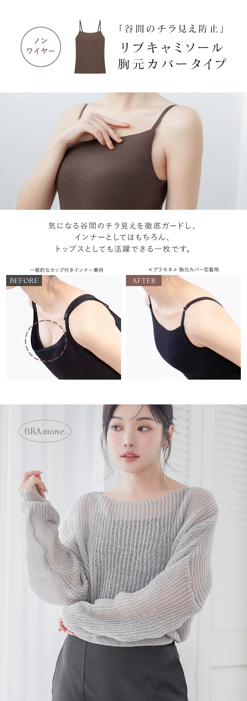 tu-hacci Inner Collection ブラキャミ単品 ~楽盛りインナーBRAmone(ブラモネ)シリーズ~ ブラ一体型で、下着+インナーの重ね着のわずらわしさから解放。 リブ素材で1枚で見せて着用できるので、コーディネートの幅が広がります。 インナーショップならではのノウハウを生かし、ワイヤレスでも自然な美胸メイクを叶えるカップを独自に開発。 「ナチュラルな盛り感が好き」「胸元や脇肉をカバーしたい」「カップが浮きやすくフィット感がほしい」方におすすめです。 ■ワイヤレスでも「フィット◎」「美胸◎」 よりリラクシーな着け心地が特徴のノンワイヤータイプ。 締め付けず、自然にスタイルアップを叶える機能が満載。 日中からおうち時間まで幅広いシーンで活躍。 【商品の特徴】 ・薄手の下厚パッドで自然なバストメイク ・首元が浮きにくく胸元のチラ見えをカバー ・見せて着られる綿混のリブ素材でコーディネートに取り入れやすい ・アンダーゴムは食い込みを軽減する平ゴムを採用 ・スムース生地で程よいホールド力とソフトな着用感を両立 【こんな方におすすめ】 ・シアートップスやカーディガンに合わせるインナーに悩む ・谷間や脇肉を隠したい ・ノンワイヤー派だけどバストの形が崩れるのが心配 ・バストボリュームが少なくカップ上部がパカパカしやすい 【こんな時におすすめです】 ・普段のインナーとして ・コーディネートに取り入れて ・おうち時間でのリラックスウェアとして ※こちらの商品は就寝中、ナイトブラとしてのご着用も可能です。 バストの横流れ防止など、より就寝中に特化した補正機能をお求めの方は、「ナイトブラカテゴリ商品」のご着用をおすすめいたします。 ※エクリュは、カップの裏の配色をリニューアルし、透けにくさを向上させました。 さらに、透けにくい厚い生地を採用することで、より透けにくい仕様となっています。 |