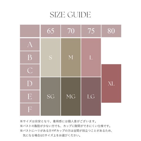 S:A65 B65 C65 SG:D65 E65 F65 M:A70 B70 C70 MG:D70 E70 F70 L:A75 B75 C75 LG:D75 E75 F75 XL:C80 D80 E80 ※対応サイズは目安となり、実際の着用感には個人差がございます。 |