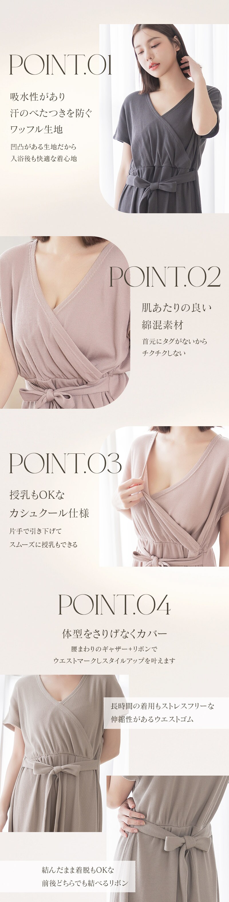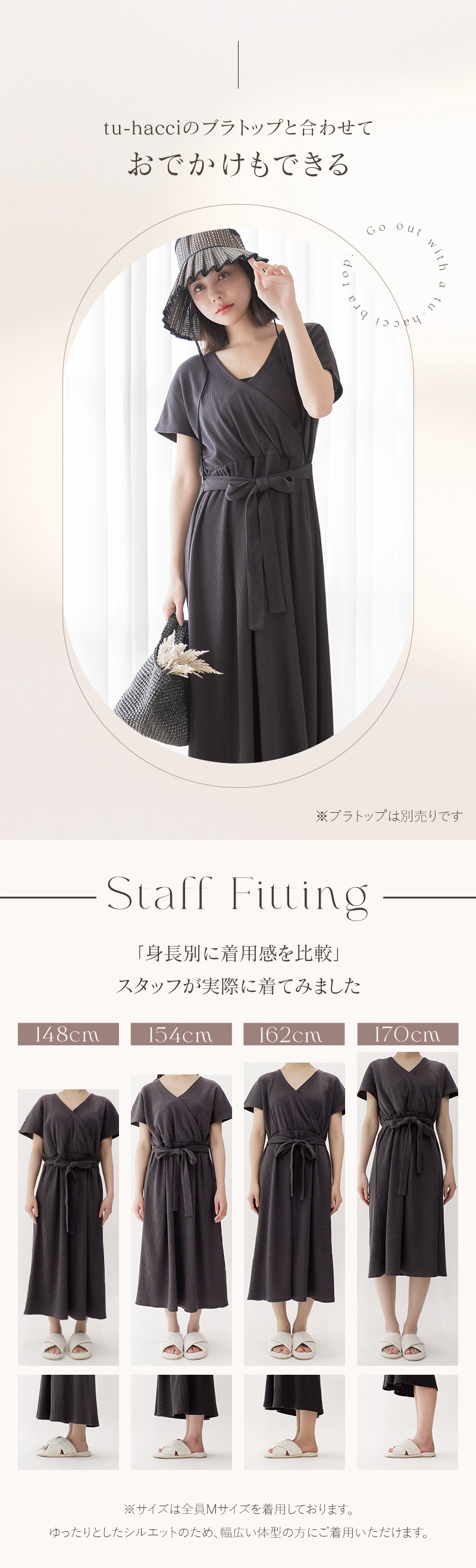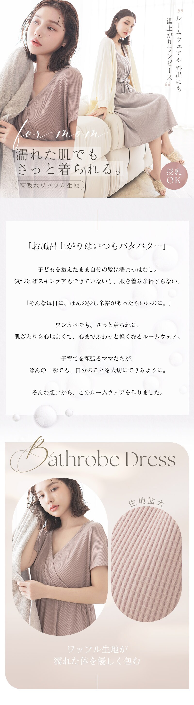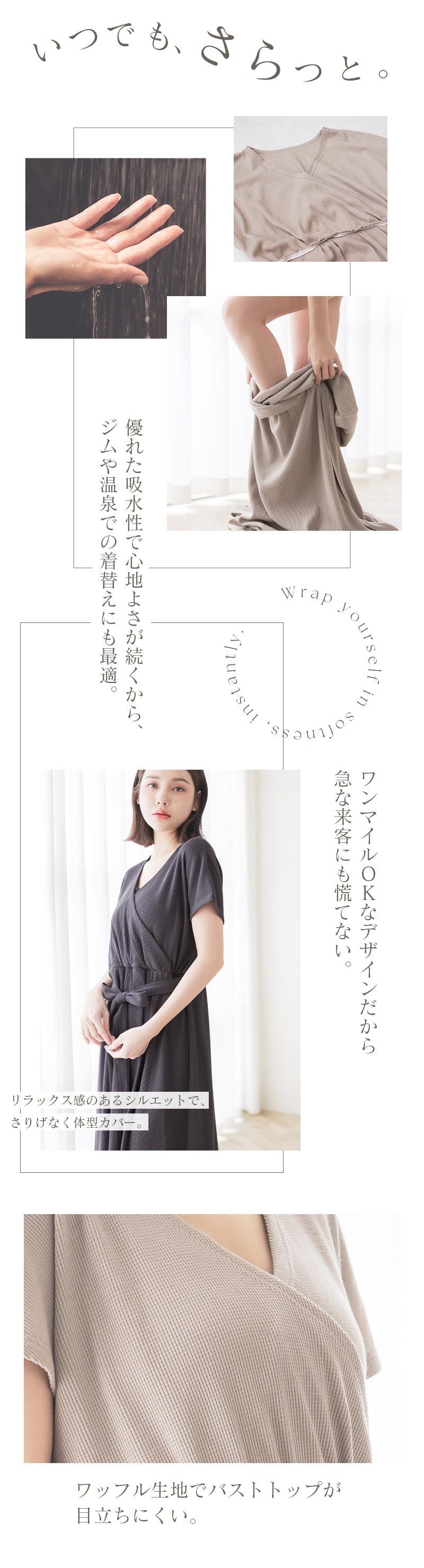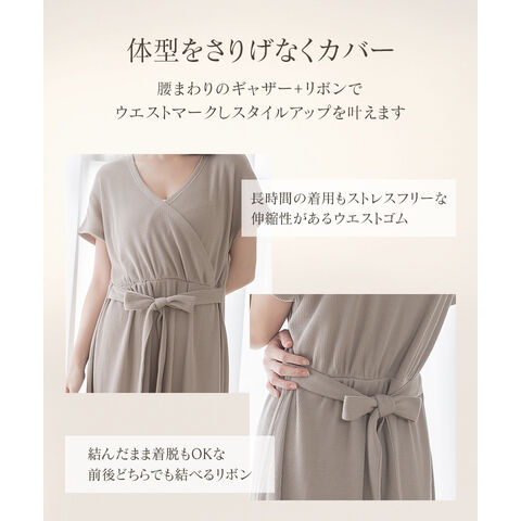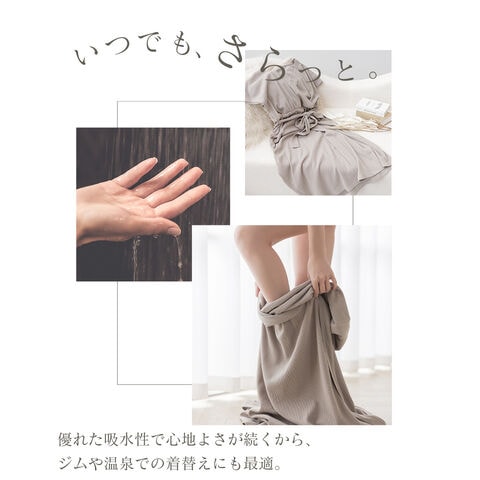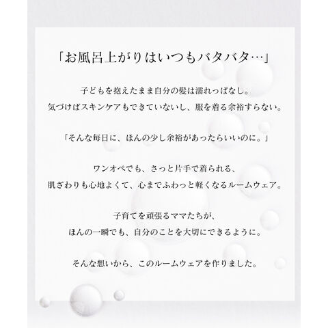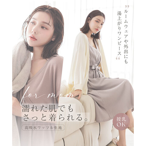tu-hacci Outbath Collection ワンピース単品 濡れた肌でも3秒でサッと着られる!湯上がりワンピース お風呂上がりのバタバタ、こんな経験ありませんか? ・すぐに子どものお世話をしたい ・なかなか汗が引かない ・スキンケアやヘアケアをすぐに済ませたい そんな声に寄り添い、毎日をより快適に過ごせる湯上がりワンピースを開発。 高吸水ワッフル生地が濡れた体をやさしく包み込み、 お風呂上がりを、もっと快適に、もっと自由に。 【商品の特徴】 ・汗を素早く吸収し、ベタつきを防ぐ高吸水ワッフル生地 ・肌触りの良い綿混素材 ・片手でサッと授乳できるカシュクール仕様 ・ウエストのギャザーとリボンでスタイルアップ効果も 【こんな時におすすめ】 ・ワンオペ育児のお風呂上がりに、サッと着替えたい ・快適な着心地が続くので、ジムや温泉での着替えに ・急な来客時や、ブラトップと合わせてちょっとしたお出かけのワンマイルウェアとして ・カシュクール仕様なので授乳服としても |