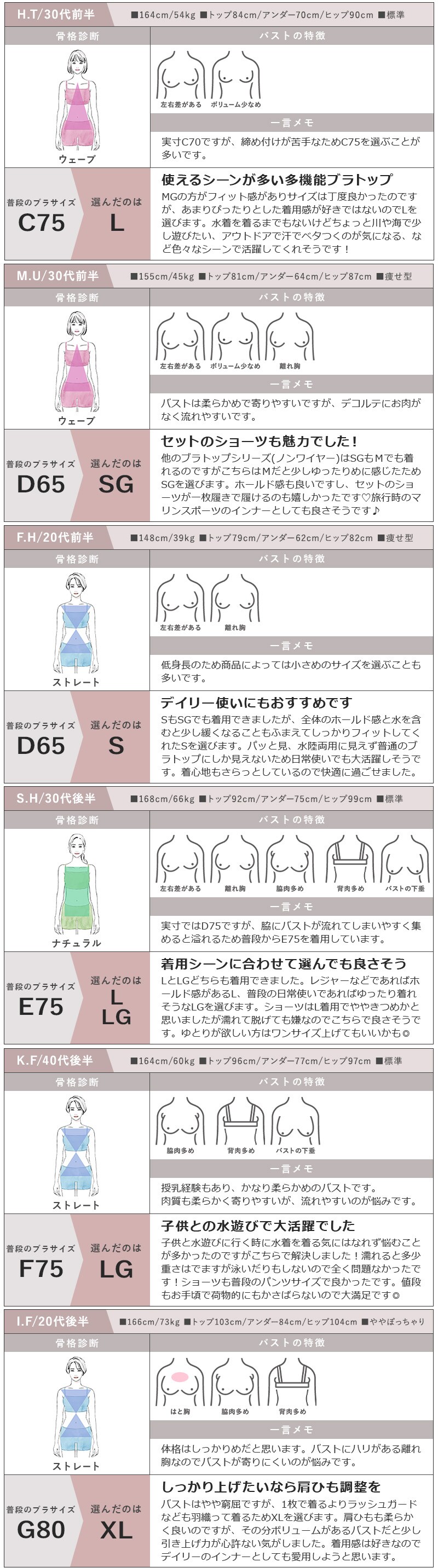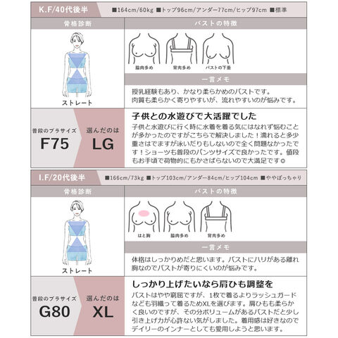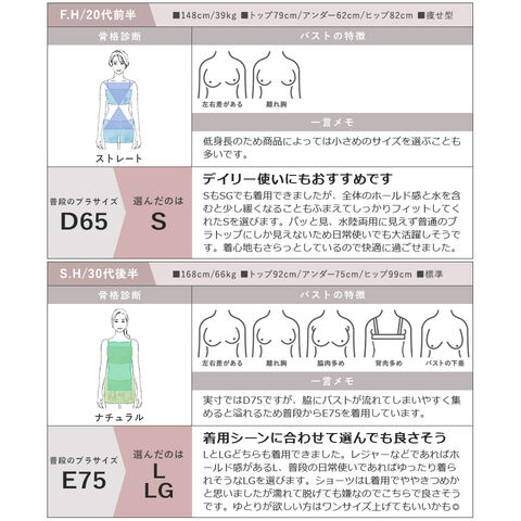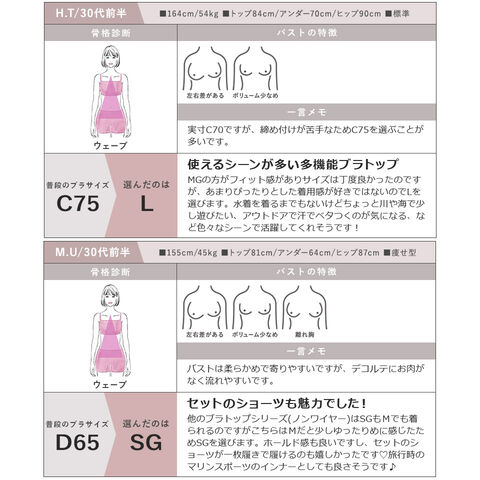 [ブラトップ平置き実寸] S:着丈 42.0cm/裾幅 38.5cm SG:着丈 43.3cm/裾幅 38.5cm M:着丈 44.6cm/裾幅 40.5cm MG:着丈 46.0cm/裾幅 40.5cm L:着丈 47.3cm/裾幅 42.5cm LG:着丈 48.6cm/裾幅 42.5cm XL:着丈 50.0cm/裾幅 4.5cm ※平置きサイズはスタッフが採寸した実寸値となり、若干の誤差が生じる場合がございます。 [ブラトップ対応サイズ] S:A65 B65 C65 SG:D65 E65 f065 M:A70 B70 C70 MG:D70 E70 f070 L:A75 B75 C75 LG:D75 E75 f075 XL:C80 D80 E80 ※対応サイズは目安となり、実際の着用感には個人差がございます。 [ショーツ対応サイズ] M:87~95cm L:92~100cm XL:97~105cm ※対応サイズは目安となります。個人差がございますので予めご了承ください。 |