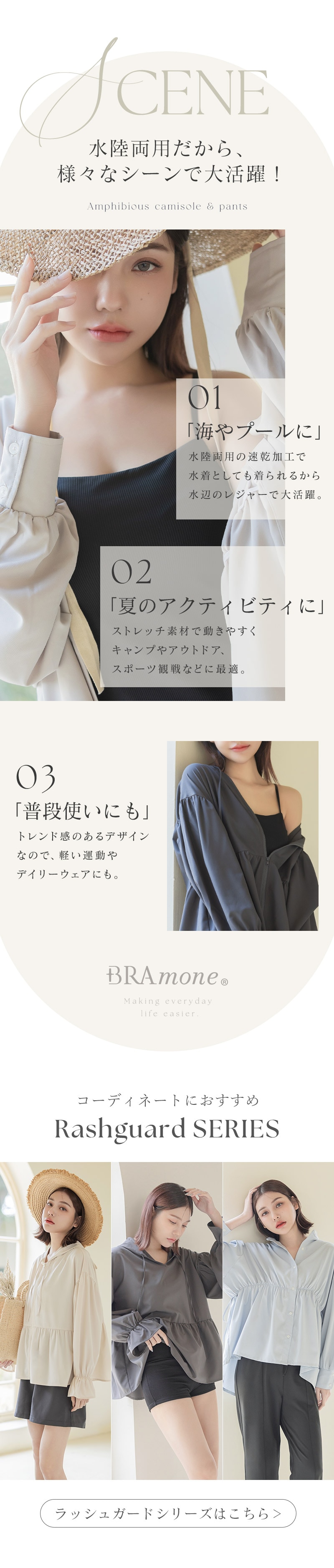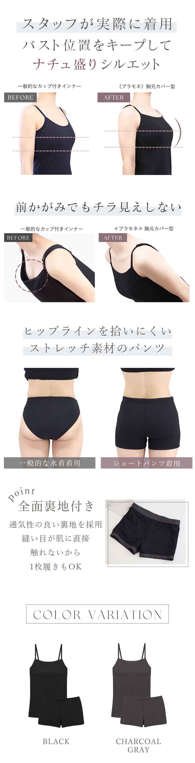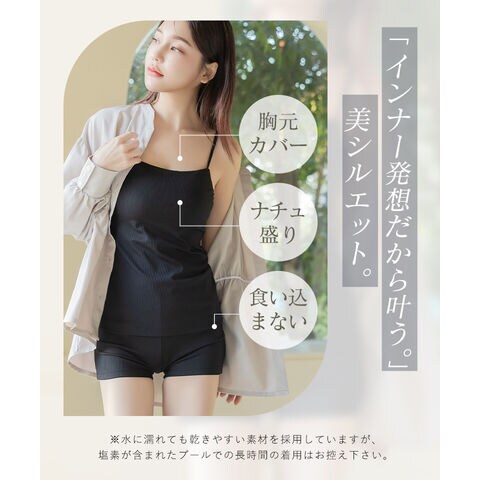胸元カバー設計で胸元のチラ見えを防止し、速乾加工だからキャンプや水遊びにもピッタリ◎