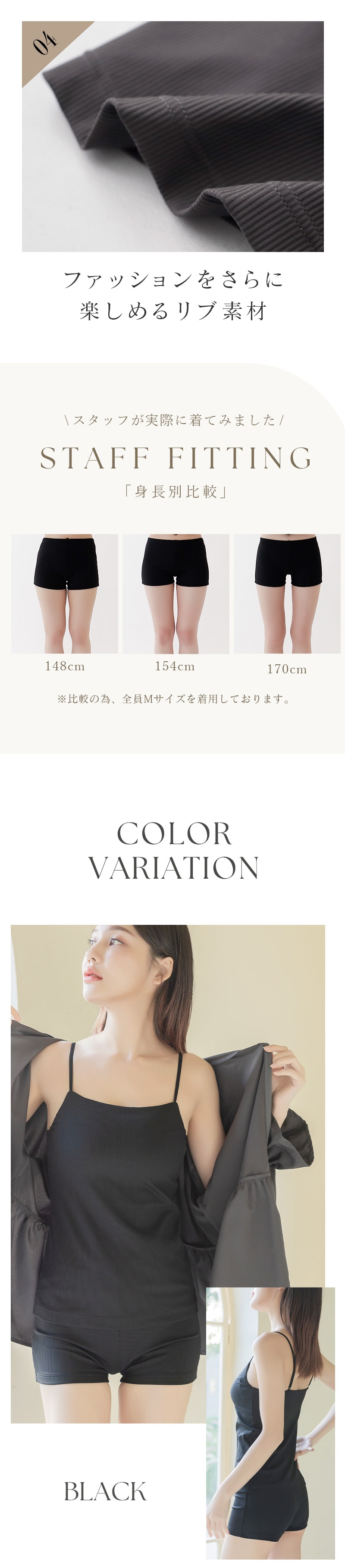 リブ素材のほどよいフィット感&ハイウエスト設計で、お腹まわりをスッキリ見せながら快適な着心地に。