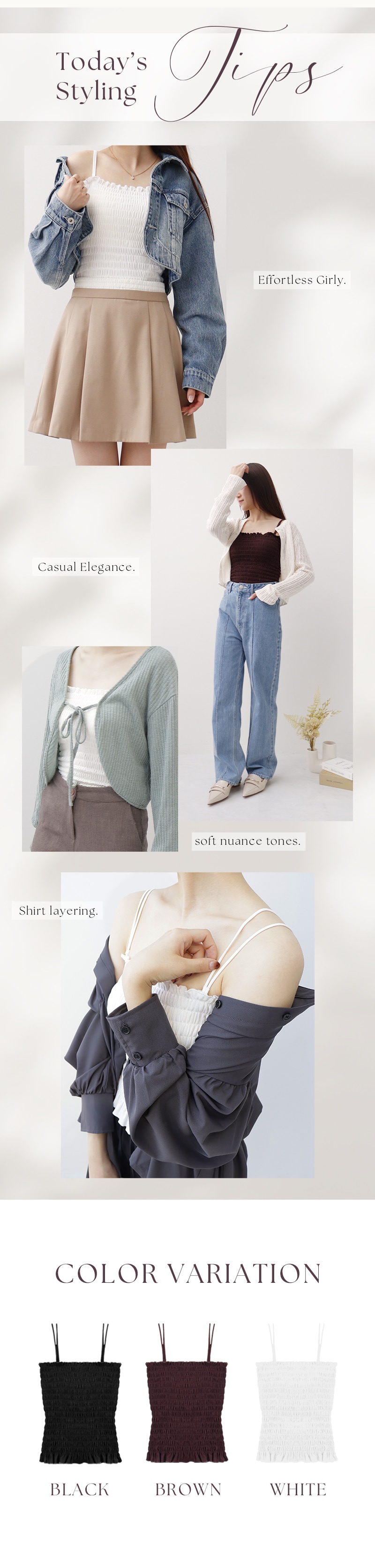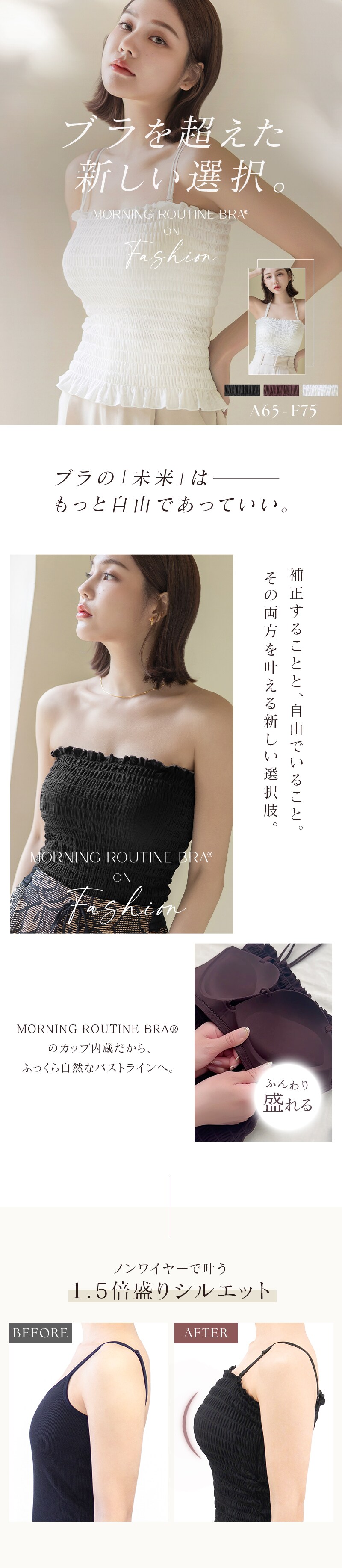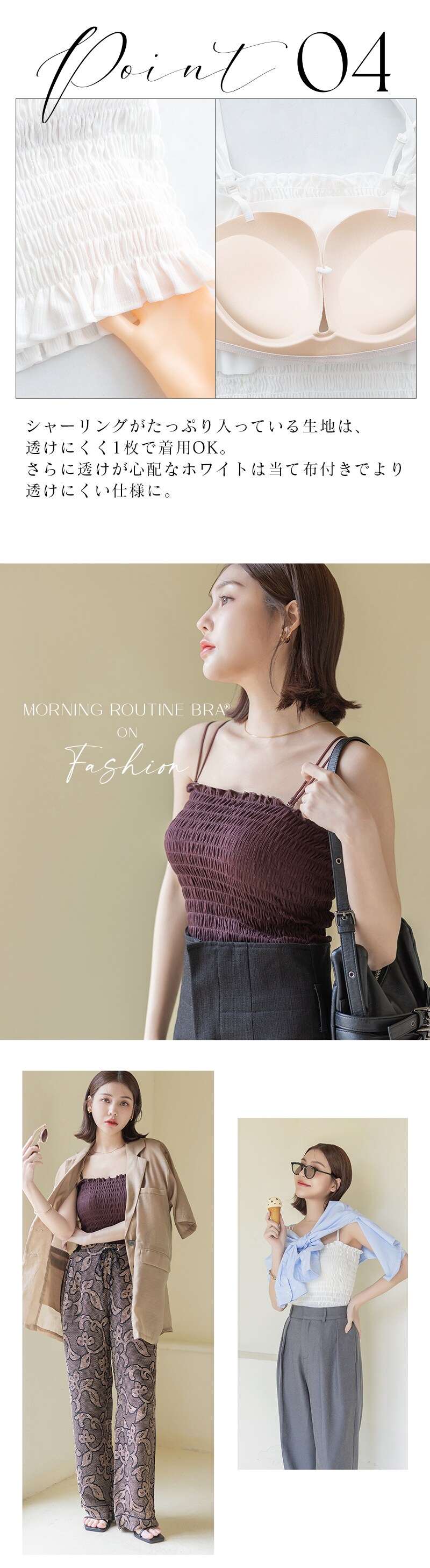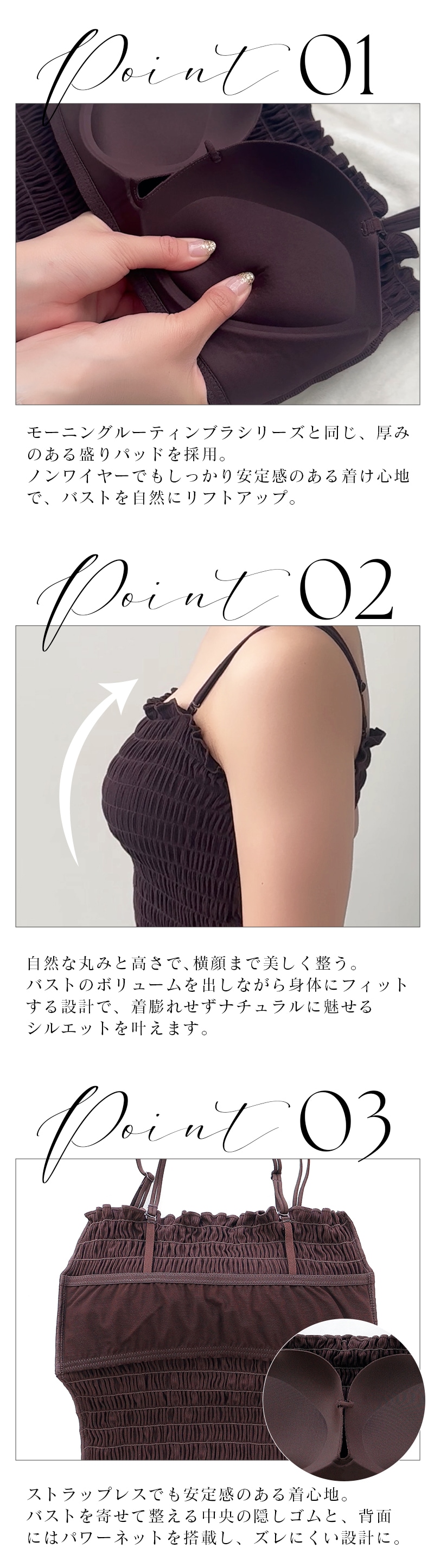 tu-hacci Inner Collection ブラトップ単品 1.5倍盛りを叶える3wayシャーリングブラトップ。 女性のボディラインを知り尽くした下着専門店のノウハウを活かして、 ノンワイヤーでも自然な丸胸をメイクする モーニングルーティンシリーズのカップを内蔵。 トレンド感のあるシャーリング素材と、取り外し可能な2種類のストラップで もっと自由にファッションを楽しむ、新しい選択肢をtu-hacciからご提案。 【こんな方におすすめ】 ・ワイヤーの窮屈感や痛いのが苦手 ・バストにボリュームが欲しいけど、胸元のチラ見えは避けたい ・ファッションアイテムとして主役にできる見せキャミがほしい ■ふっくら丸みのある1.5倍盛りシルエット ・人気No.1ノンワイヤーブラの盛りカップを採用 ・中央の隠しゴムが、美胸を長時間キープ ・背中までぐるりとパワーネット搭載し、ズレにくく安心の着心地 ・ボリュームアップしつつ、サイドはスッキリとした設計 ■ファッショナブルな見せキャミ ・トレンド感のあるシャーリング素材でコーデの主役に◎ ・様々なコーディネートを楽しめる、取り外し可能な2種類のストラップ ・カラーごとに異なる色味のカップ・パワーネットだから透けにくい ■チラ見え防止で視線が気にならない ・胸元高めデザインで“盛れる胸元隠し” ・前屈みになっても安心な“谷間隠し” ※お使いのスマホの画面によっては、実際の色味と異なる場合がございます。 ※しっかりとしたフィット感がお好みの場合は、小さめのアンダーサイズをご検討ください。 |