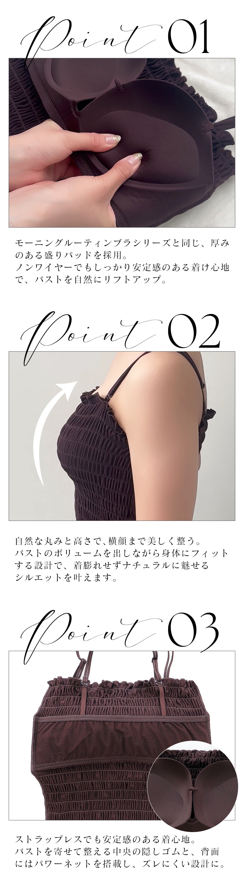 ストラップ取り外し:可 ストラップ長さ調節:可 パッド取り外し:不可 ワイヤー:なし ※商品のバーコードシールの印字が「2way」となっていますが、ストラップレス・ツインストラップ・ホルターストラップの3wayでお使いいただけます。 |
