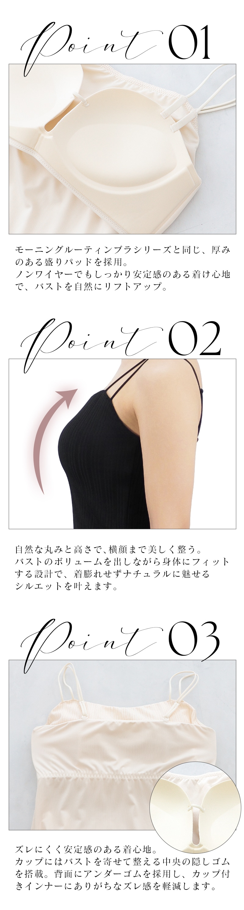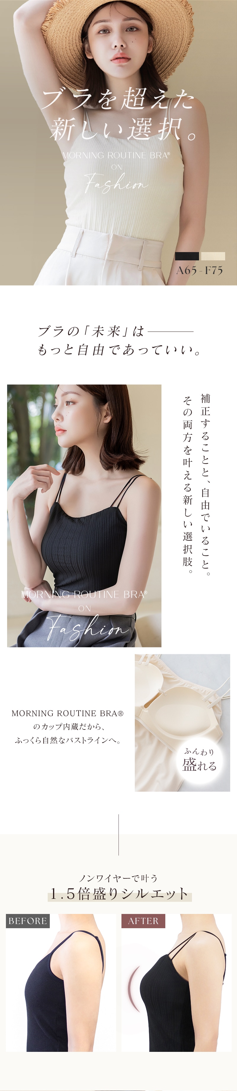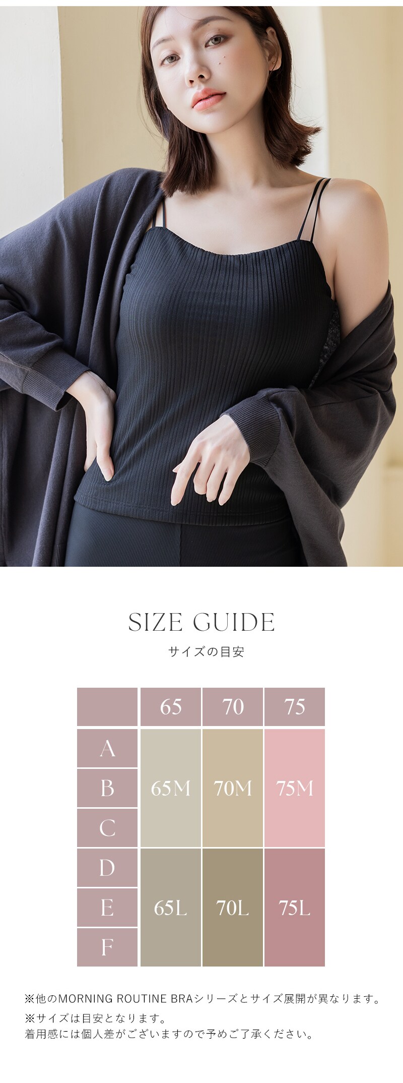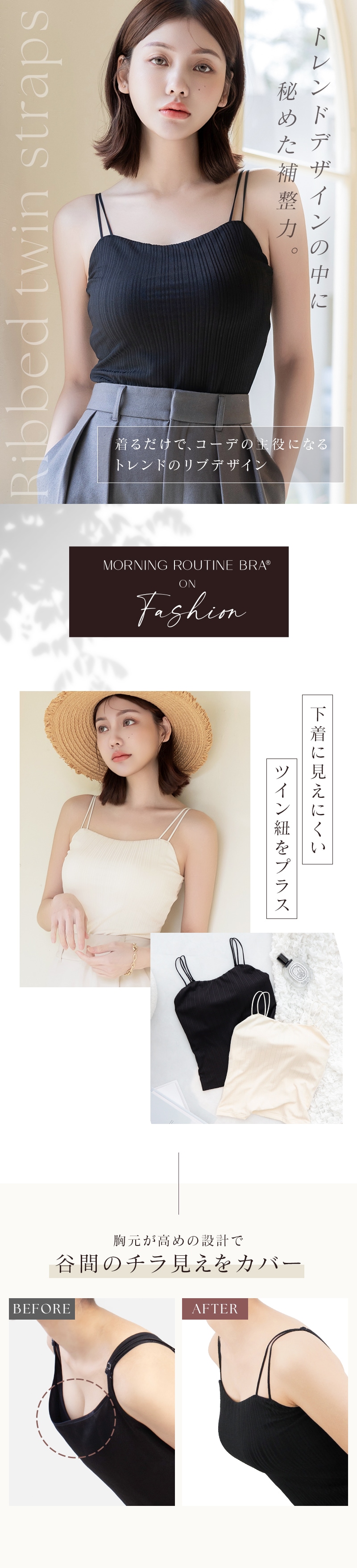 tu-hacci Inner Collection ブラトップ単品 1.5倍盛りを叶える リブツインストラップブラトップ 女性のボディラインを知り尽くした下着専門店のノウハウを活かして、 ノンワイヤーでも自然な丸胸をメイクする モーニングルーティンシリーズのカップを内蔵。 トレンド感のあるリブデザインと、下着見えしにくいツインストラップで もっと自由にファッションを楽しむ、新しい選択肢をtu-hacciからご提案。 【こんな方におすすめ】 ・ワイヤーの窮屈感や痛いのが苦手 ・バストにボリュームが欲しいけど、胸元のチラ見えは避けたい ・ファッションアイテムとして主役にできる見せキャミがほしい ■ふっくら丸みのある1.5倍盛りシルエット ・人気No.1ノンワイヤーブラの盛りカップを採用 ・カップにはバストを寄せて整える中央の隠しゴムを搭載 ・背面にアンダーゴムを採用し、ズレにくく安定感のある着心地 ・ノンストレスにボリュームアップしつつ、サイドはスッキリ ■ファッショナブルな見せキャミ ・トレンド感のあるリブ素材でコーデの主役に◎ ・全面裏地付きで透けにくいから、1枚で着用OK ・お腹が隠れるクロップド丈で、着やすさとトレンド感を両立 ■チラ見え防止で視線が気にならない ・胸元高めデザインで“盛れる胸元隠し” ・前屈みになっても安心な“谷間隠し” |